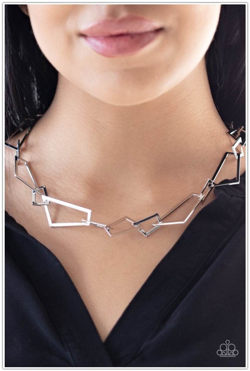 NECKLACE: An edgy collection of trapezoid-like silver frames link below the collar, creating a bold industrial display. Features an adjustable clasp closure.
