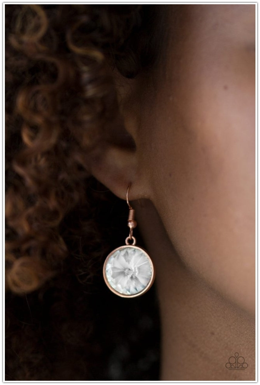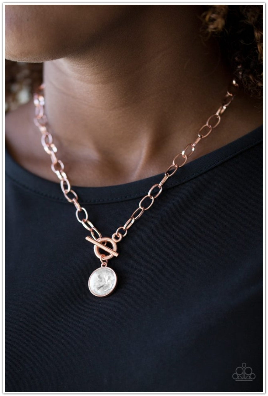 NECKLACE: A dramatic white gem swings from the bottom of a shiny copper chain, creating a blinding pendant below the collar. Features a toggle closure.