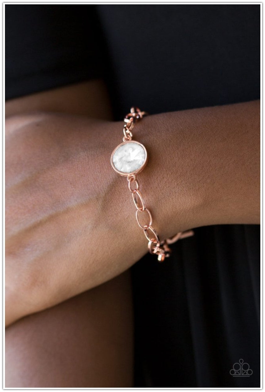 BRACELET - A dramatic white gem attaches to a shiny copper chain, creating a blinding centerpiece atop the wrist. Features a toggle closure.
