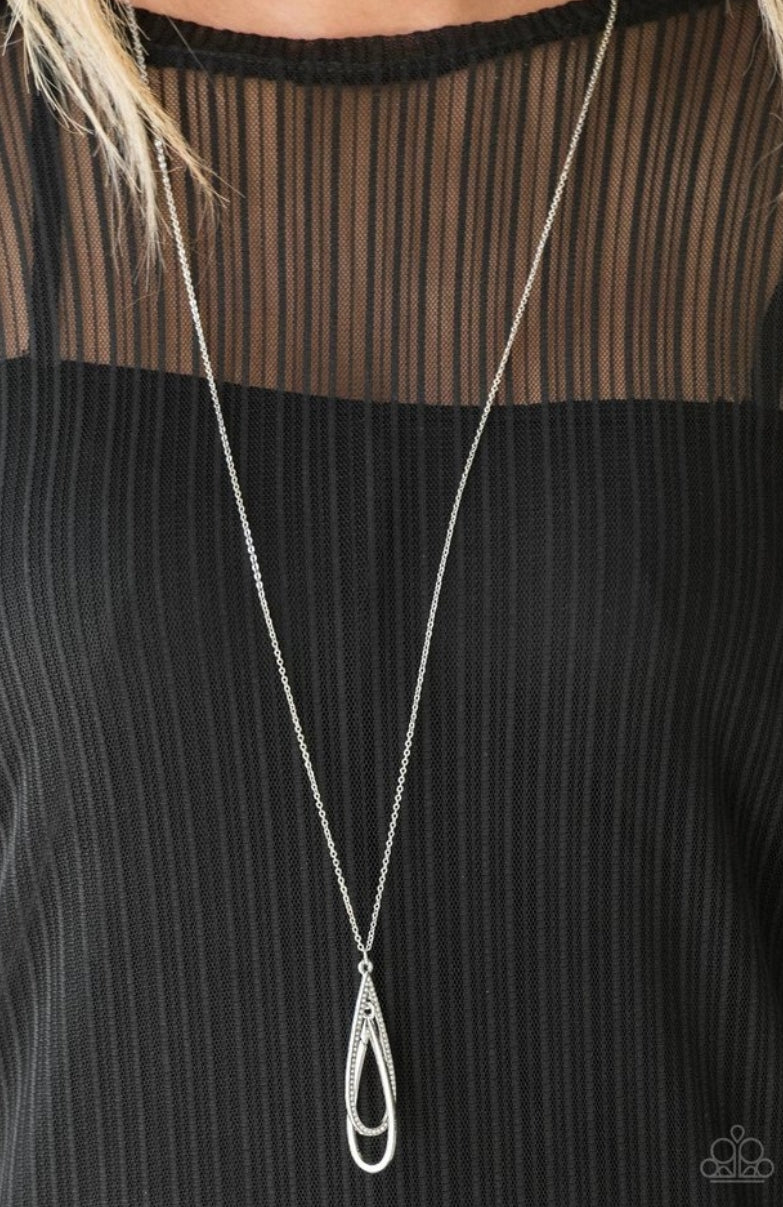 Necklace: Infused with an elegantly elongated silver chain, a wh. ite rhinestone encrusted teardrop interlocks with a smooth silver teardrop, creating a refined pendant. Features an adjustable clasp closure.