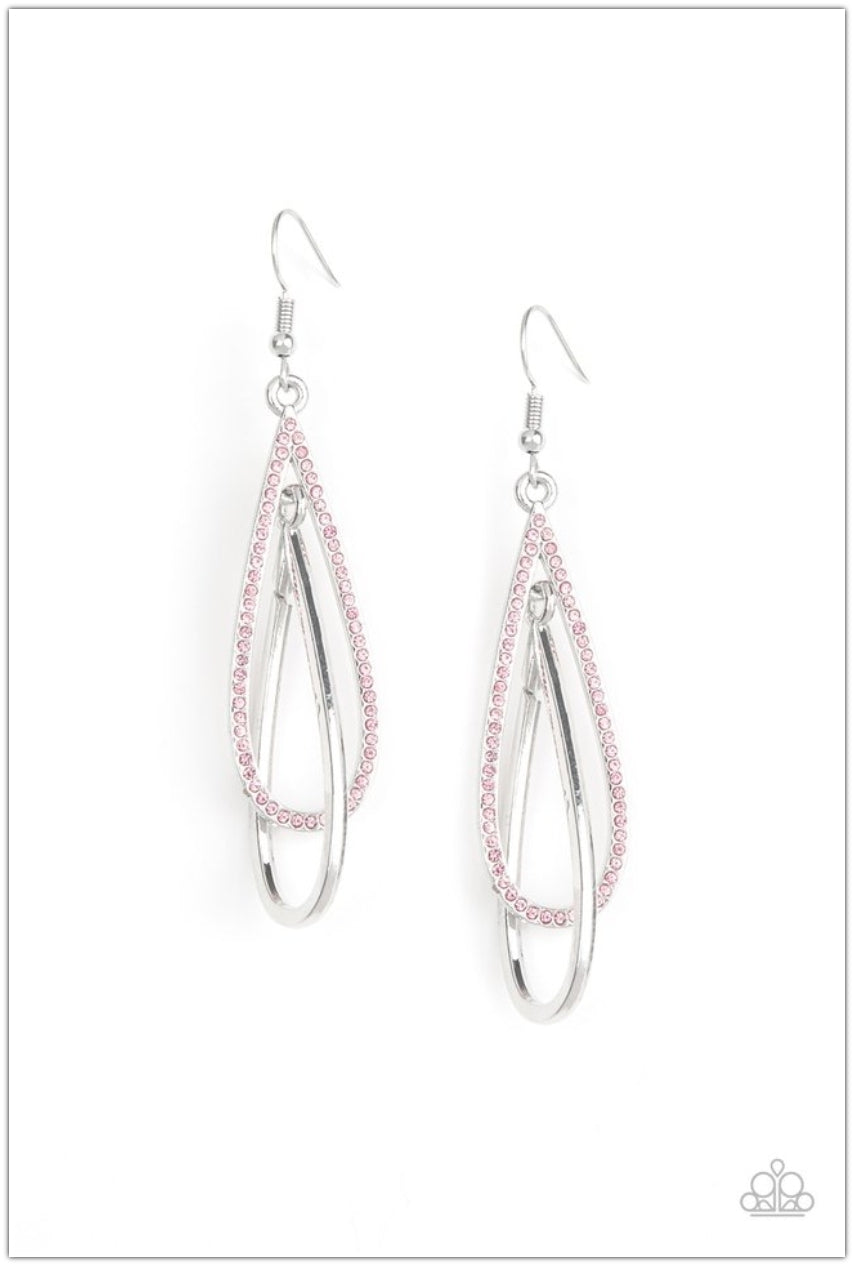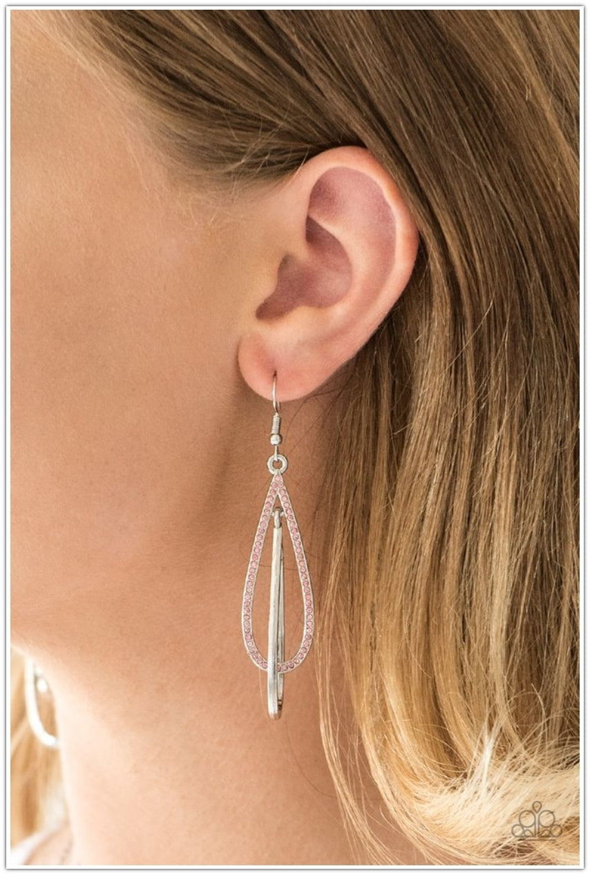 Earring: A pink rhinestone encrusted teardrop interlocks with a smooth silver teardrop, creating a refined lure. Earring attaches to a standard fishhook fitting.