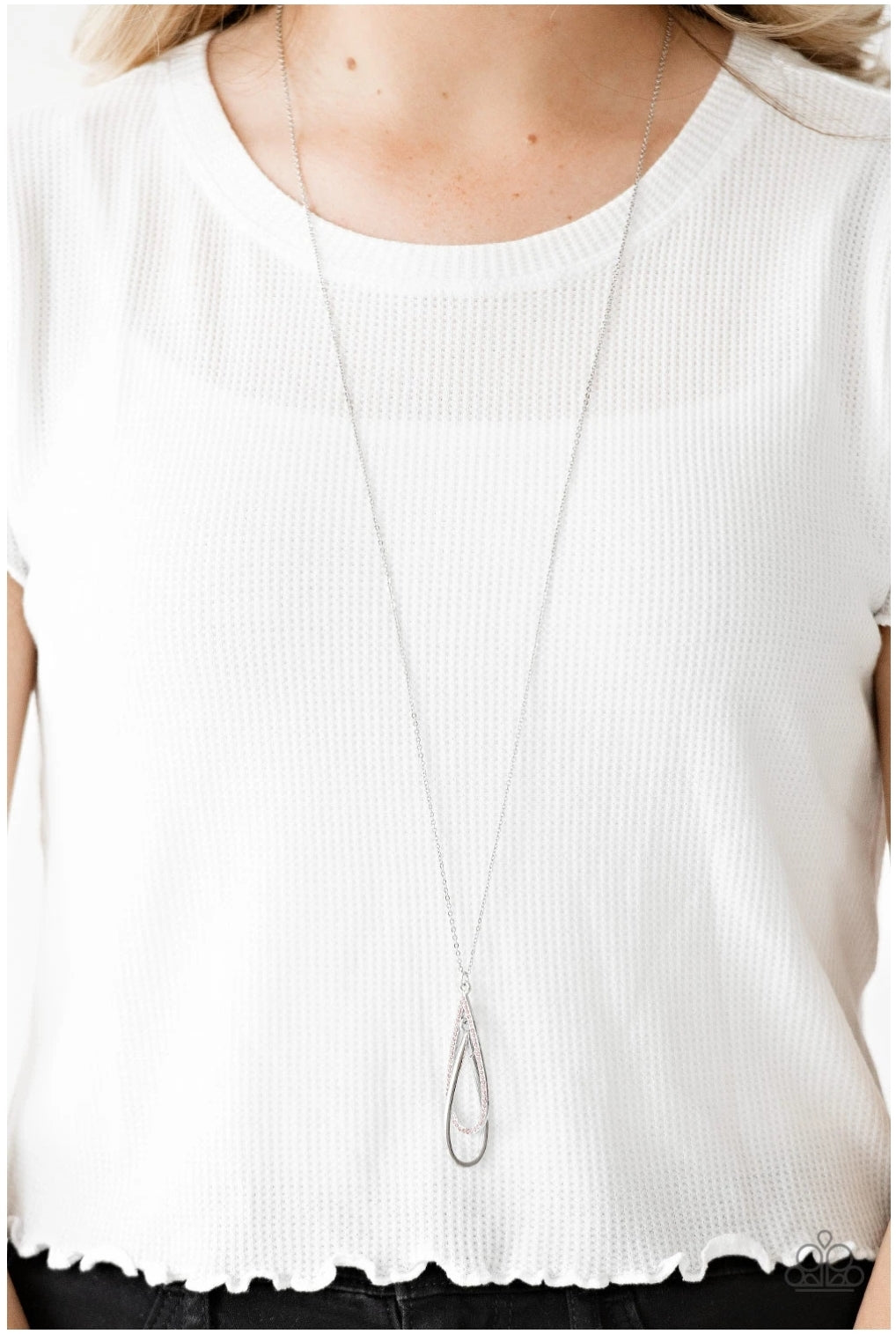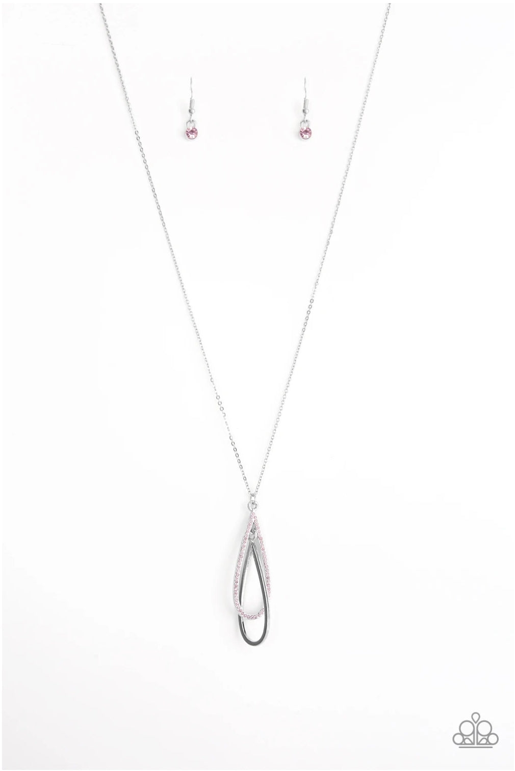 Necklace: Infused with an elegantly elongated silver chain, a pink rhinestone encrusted teardrop interlocks with a smooth silver teardrop, creating a refined pendant. Features an adjustable clasp closure.