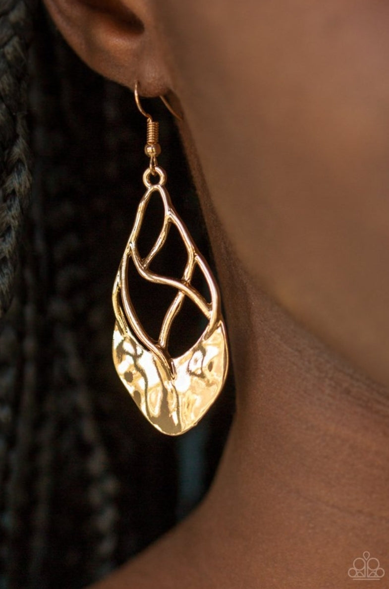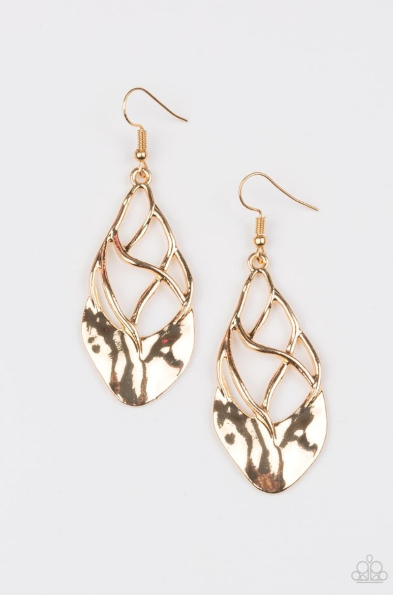 EARRING: Twisting gold bars attach to a delicately hammered gold plate, coalescing into a refined lure. Earring attaches to a standard fishhook fitting.