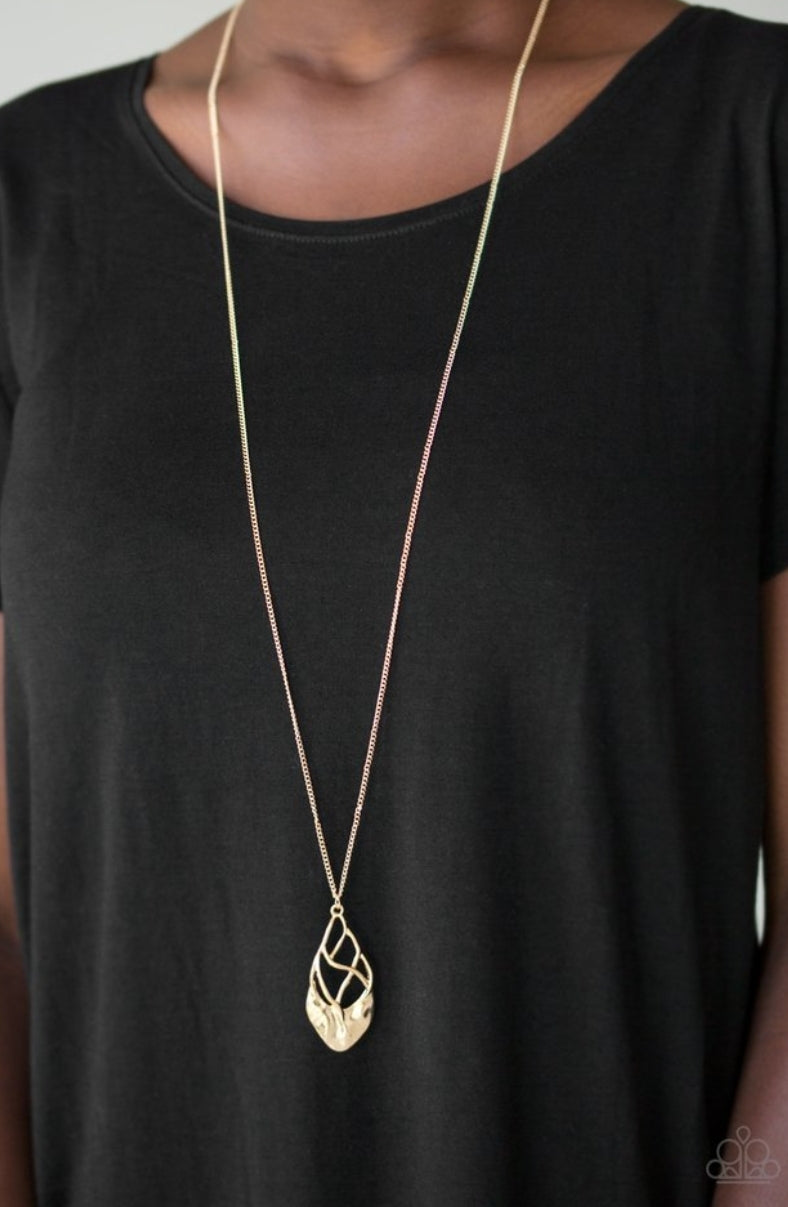 NECKLACE: Swinging from the bottom of an elongated gold chain, twisting gold bars attach to a delicately hammered gold plate, coalescing into a refined pendant. Features an adjustable clasp closure.