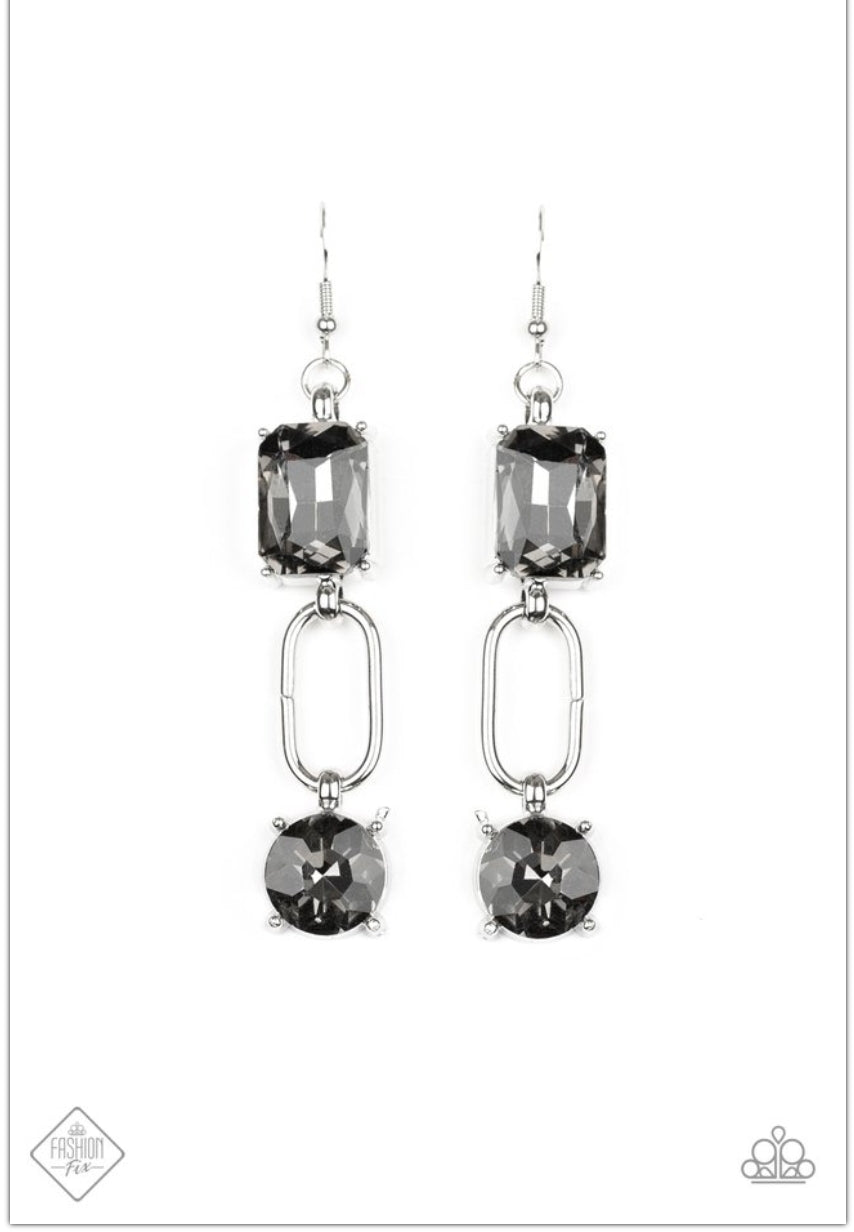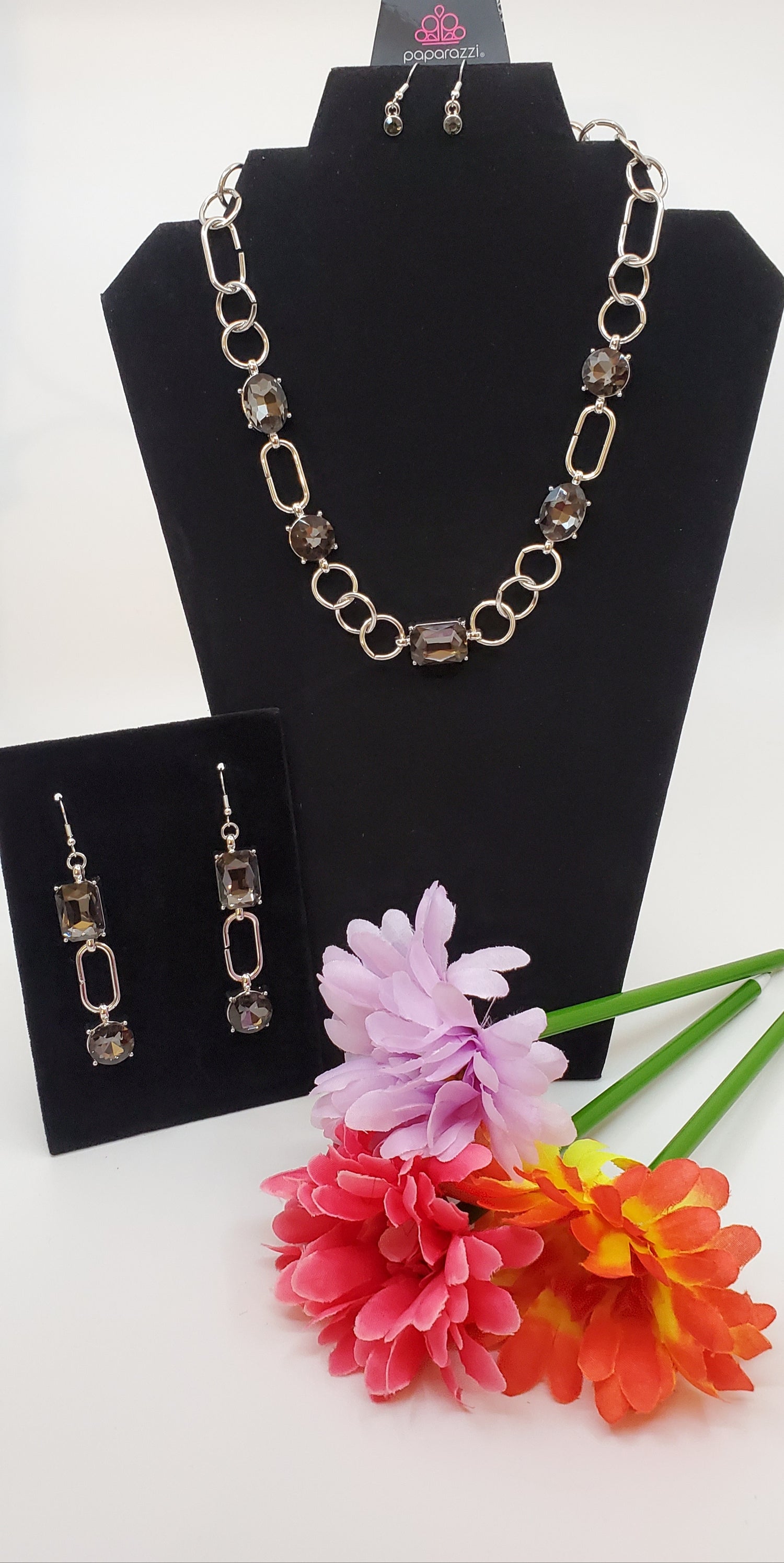 Necklace: An exaggerated smoky rhinestone is suspended from an elongated silver link that swings from an oversized emerald cut smoky rhinestone, creating a cascading lure. Earring attaches to a standard fishhook fitting.