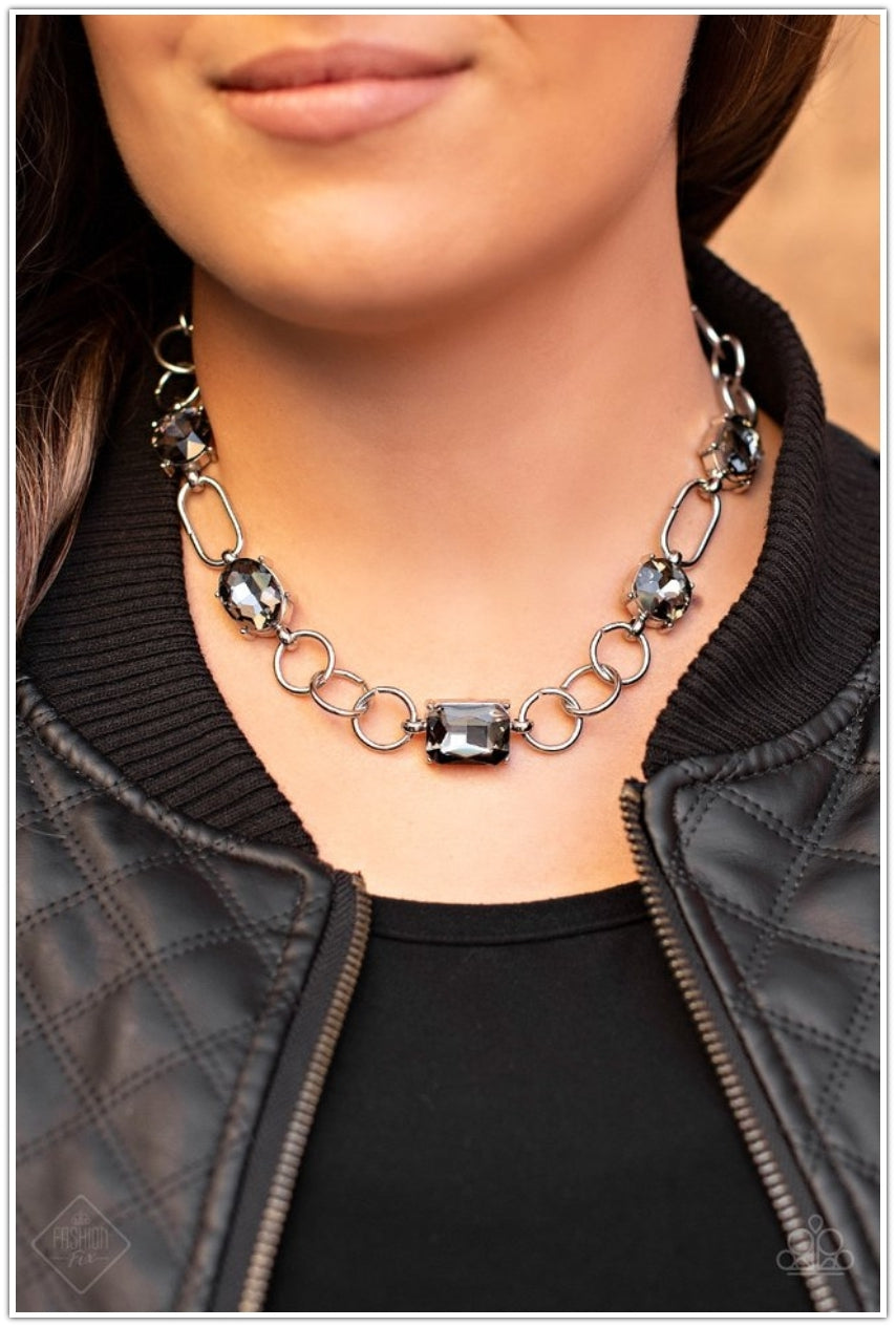 Bracelet: A collection of smoky rhinestones in a variety of round, oval, and emerald cuts are strung together by mismatched silver links below the collar for an edgy glamorous look. Features an adjustable clasp closure.