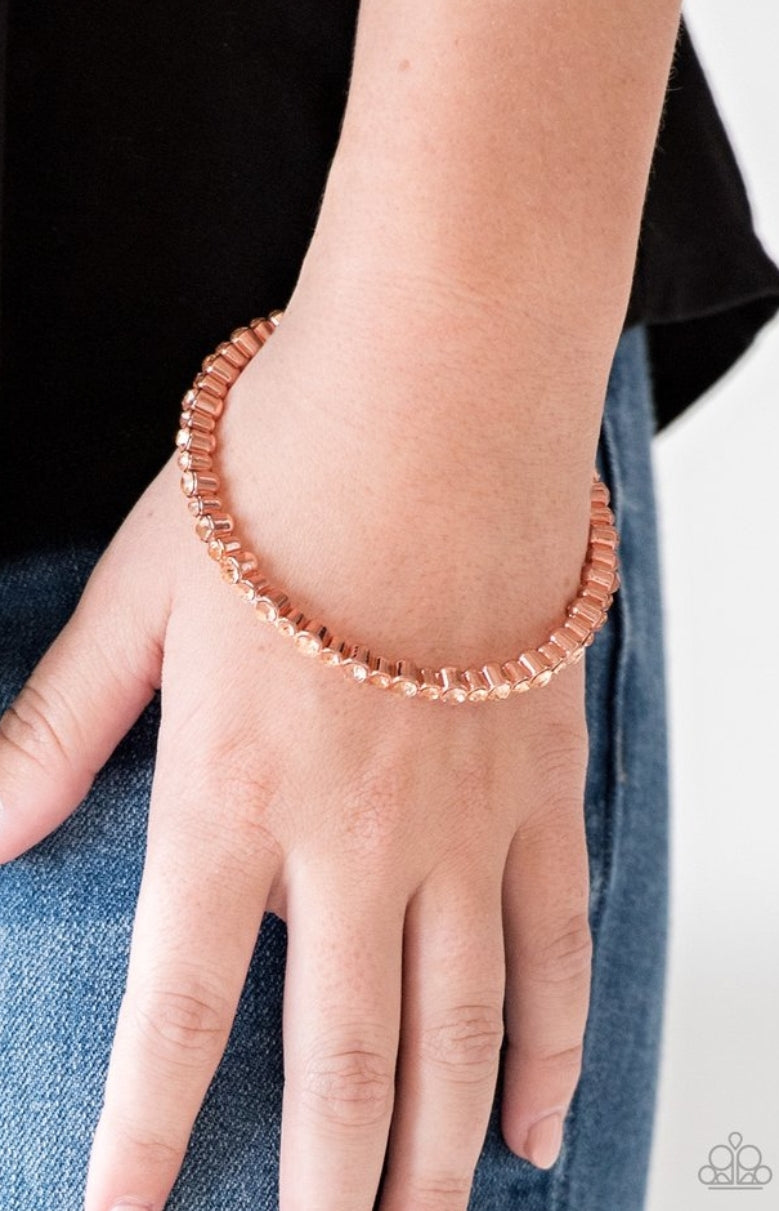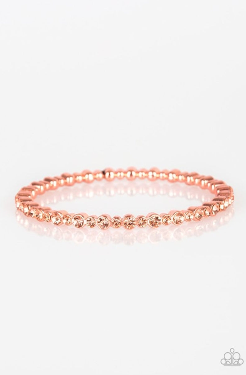 A shiny copper bangle is encrusted in countless peach rhinestones for a timeless look.