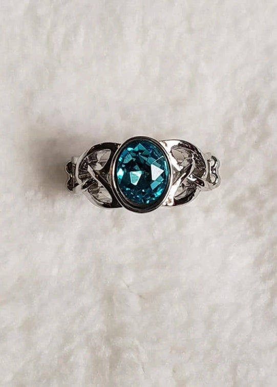 A glittery blue gem is pressed into the center of a shimmery silver band rippling in a filigree pattern for a refined look. Features a dainty stretchy band for a flexible fit.