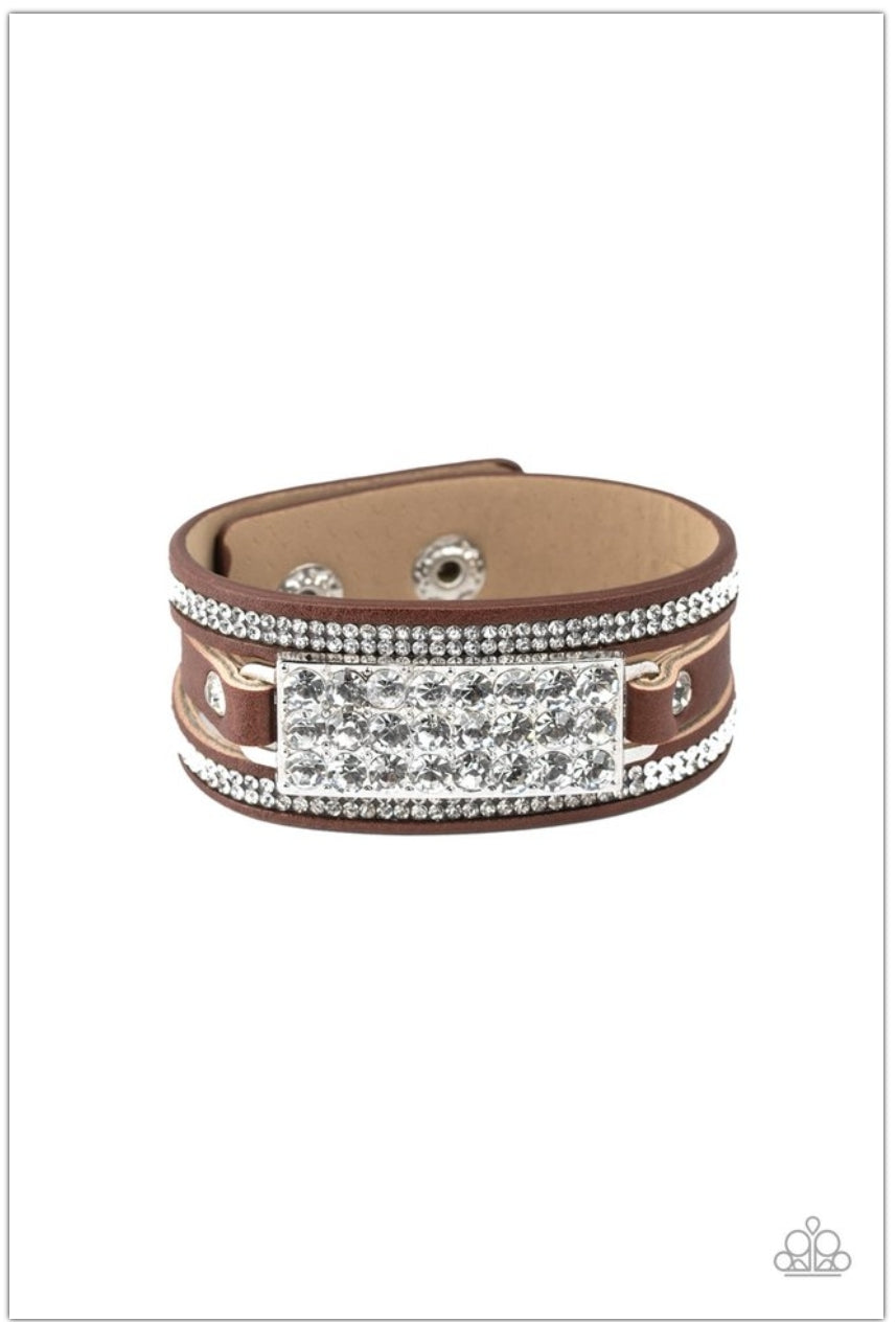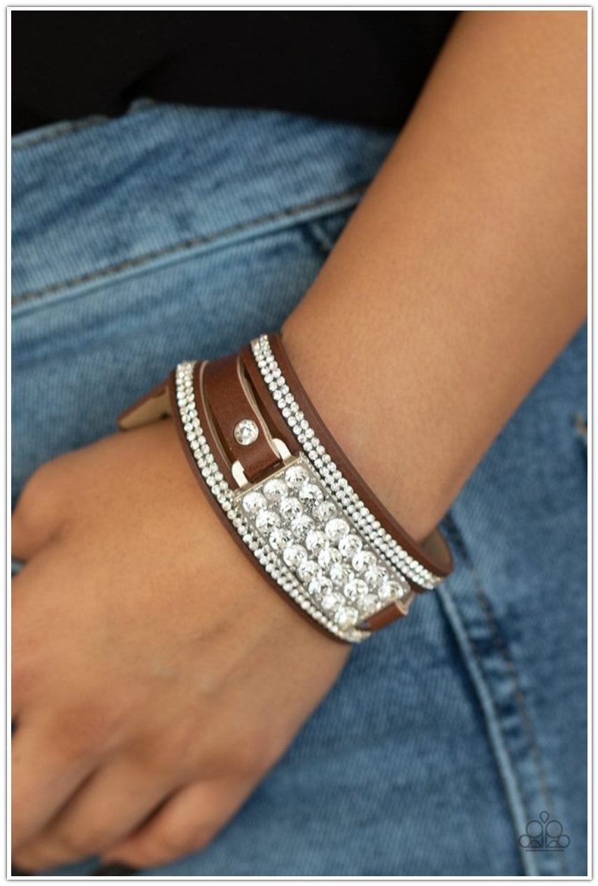 A thick brown leather band is spliced into three separate strands. Encrusted in rows of glassy white rhinestones, two glittery strands flank a blinding silver buckle encrusted in oversized white rhinestones for a glamorous finish. Features an adjustable snap closure.