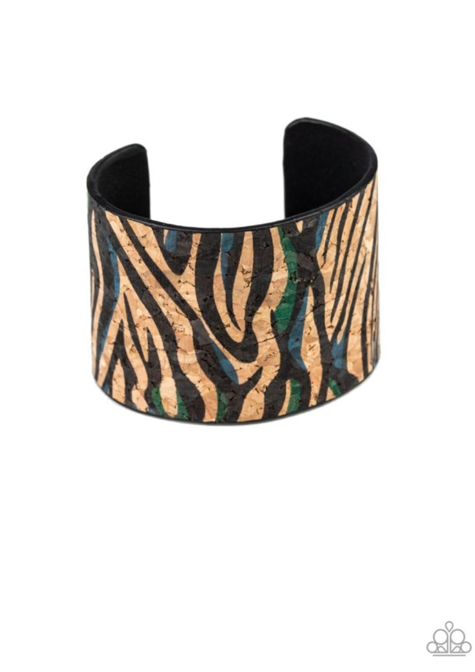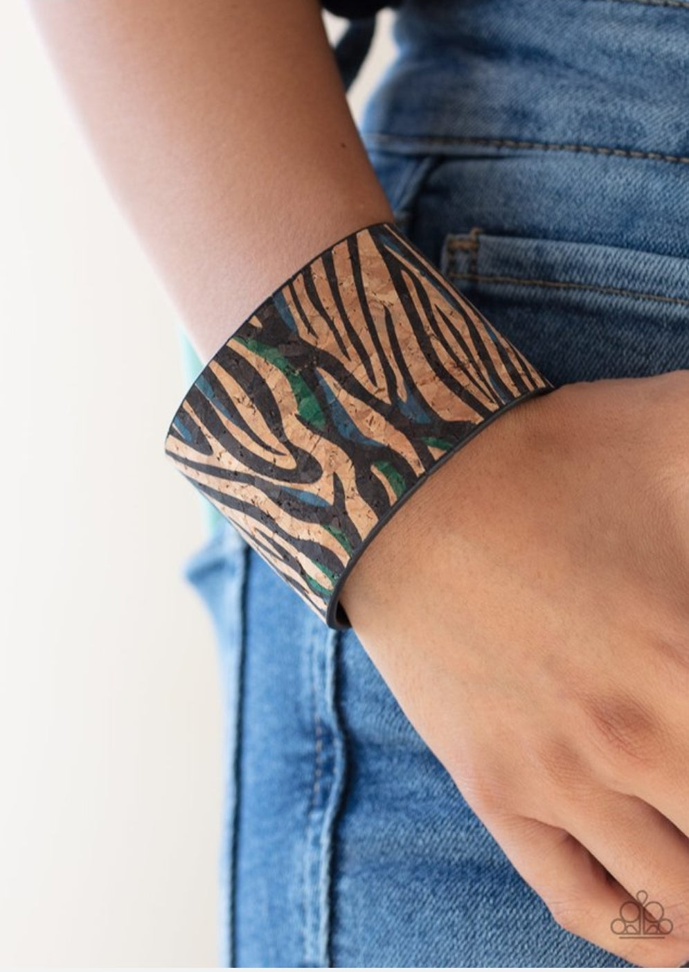 Black, blue, and green zebra stripes are printed across the front of a cork-like cuff for an adventurous look.