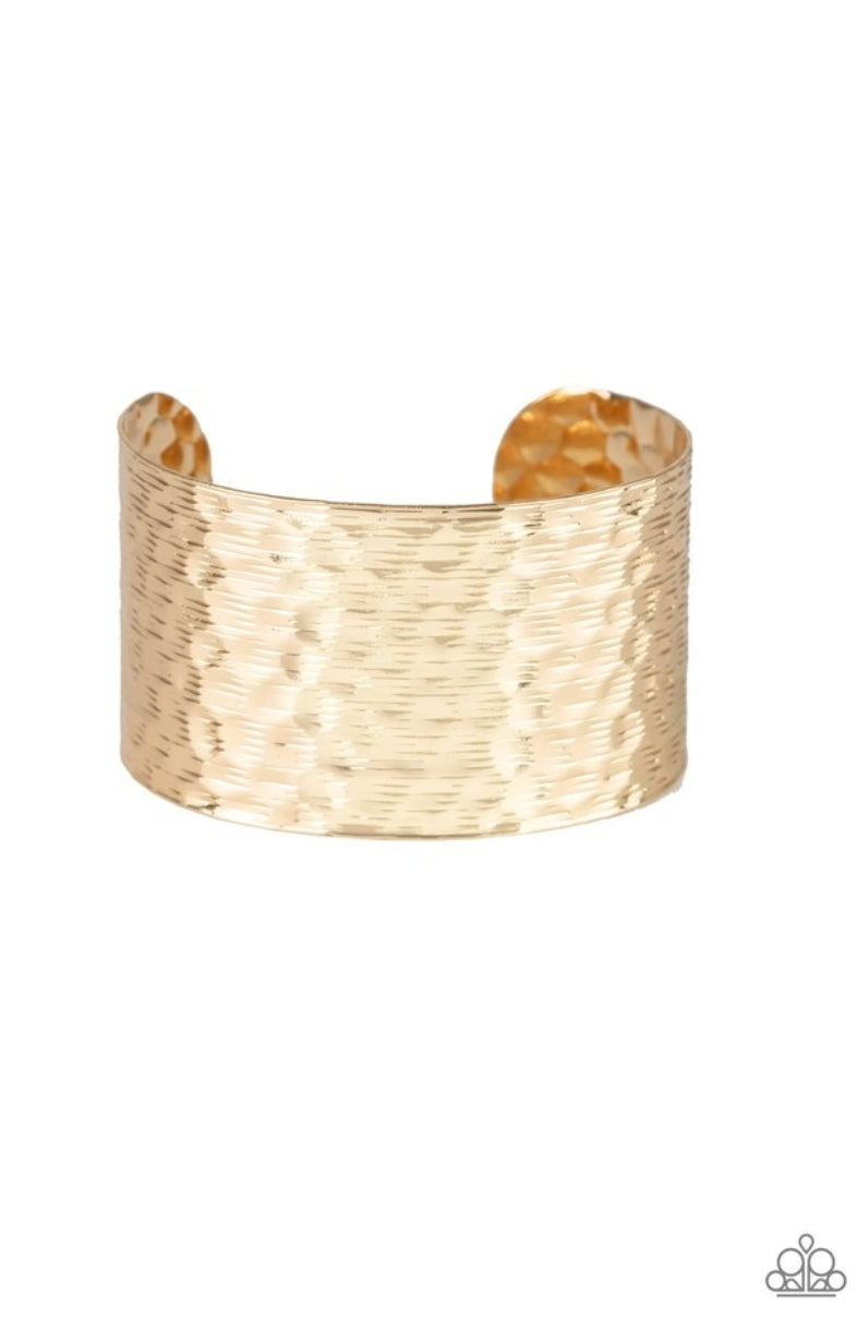 Delicately scratched and hammered in endless shimmer, a thick gold cuff wraps around the wrist for a bold industrial flair.