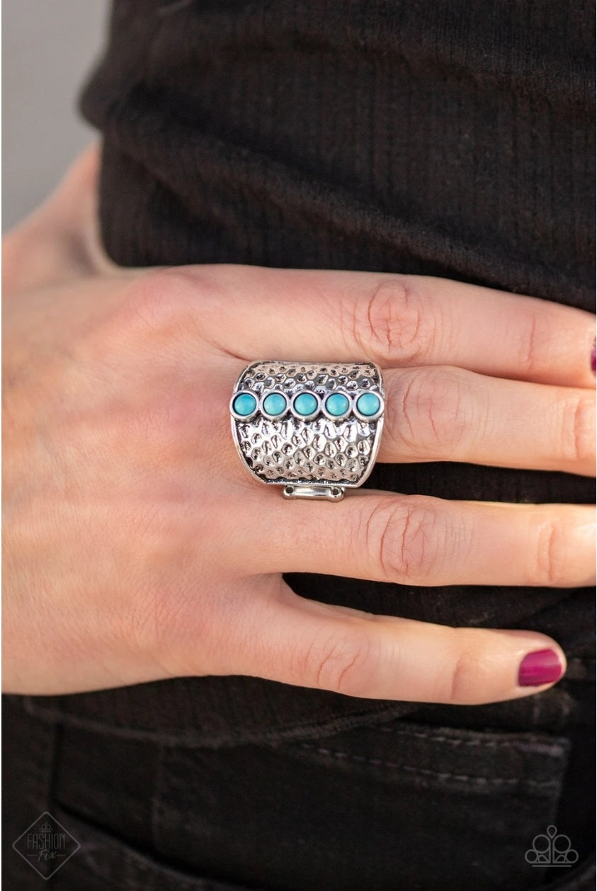 Ring: "A Line In The SANDSTONE" (P4SE-BLXX-196RS)- A row of dainty turquoise stones are stacked vertically down the center of a hammered silver frame for a seasonal flair. Features a stretchy band for a flexible fit.
