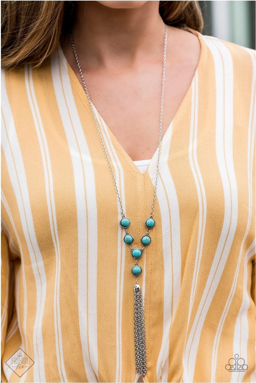 Necklace: "Rural Heiress" (P2SE-BLXX-411SZ)- Refreshing turquoise stone frames link at the bottom of a lengthened silver chain, giving way to a shimmery silver chain tassel in a wanderlust finish. Features an adjustable clasp closure.