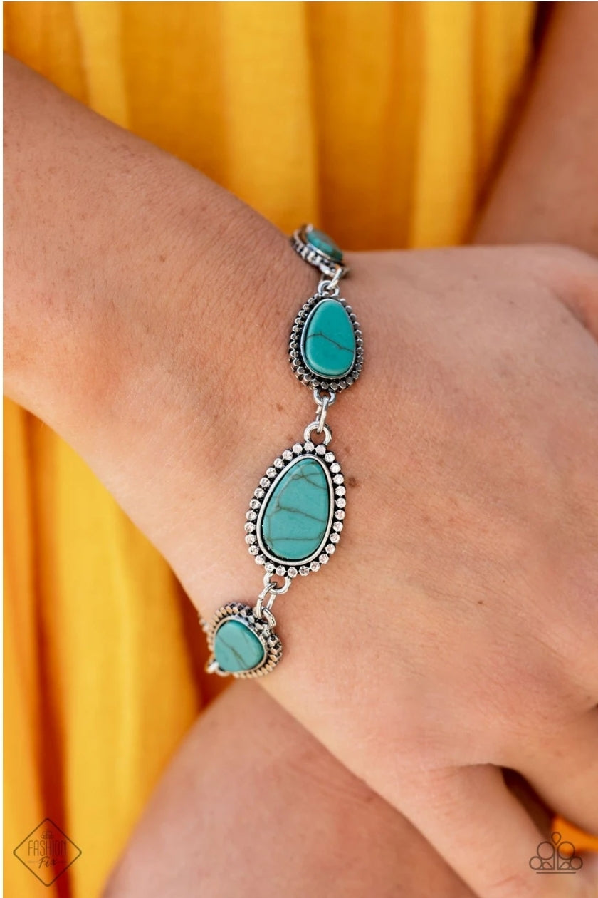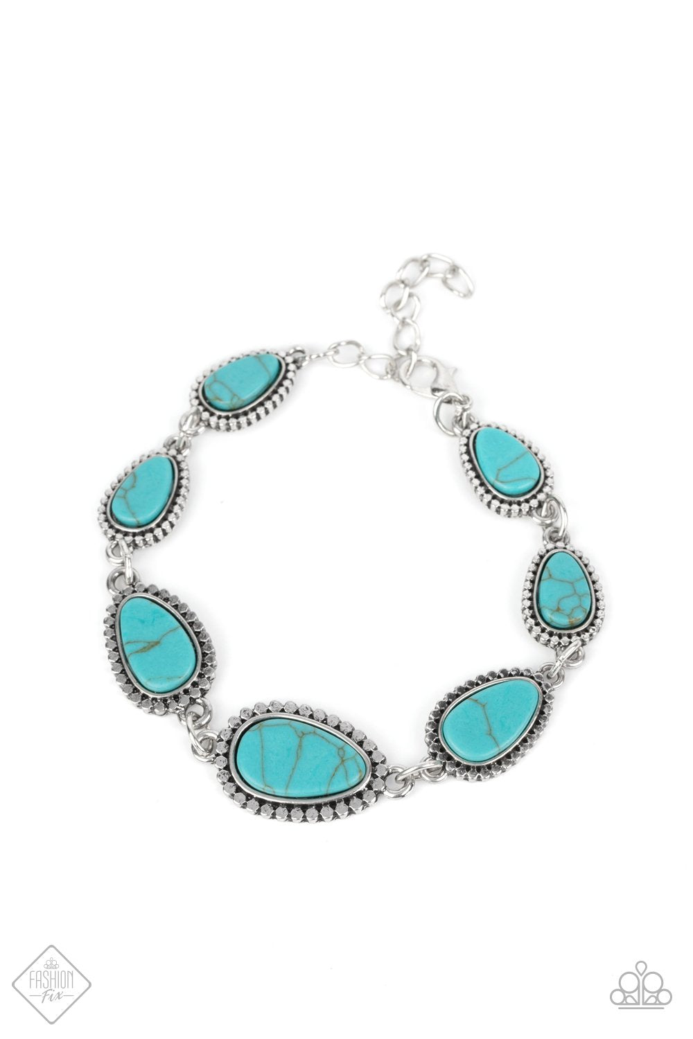 Bracelet: "Elemental Exploration" (P9SE-BLXX-355CP)- Encased in frames of flattened silver studs, pieces of flat turquoise stone teardrops gradually increase in size as they link around the wrist for an artisan-inspired look. Features an adjustable clasp closure.