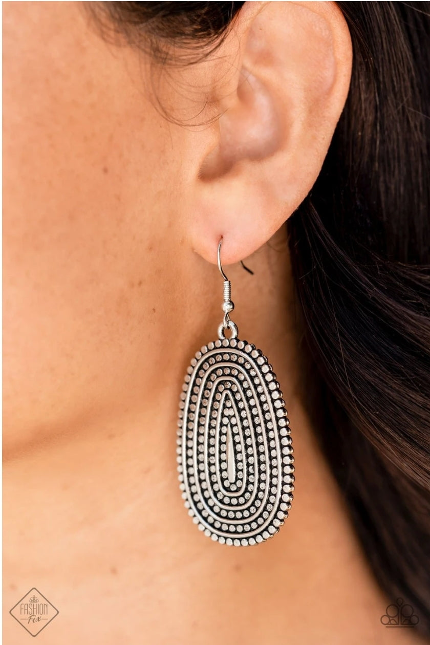 Earring: "Desert Climate" (P5BA-SVXX-137CP)- Rows of antiqued silver dotted texture radiate outward from an embossed center. The concentric lines create a rippling effect across the frame resulting in a rustic finish. Earring attaches to a standard fishhook fitting.