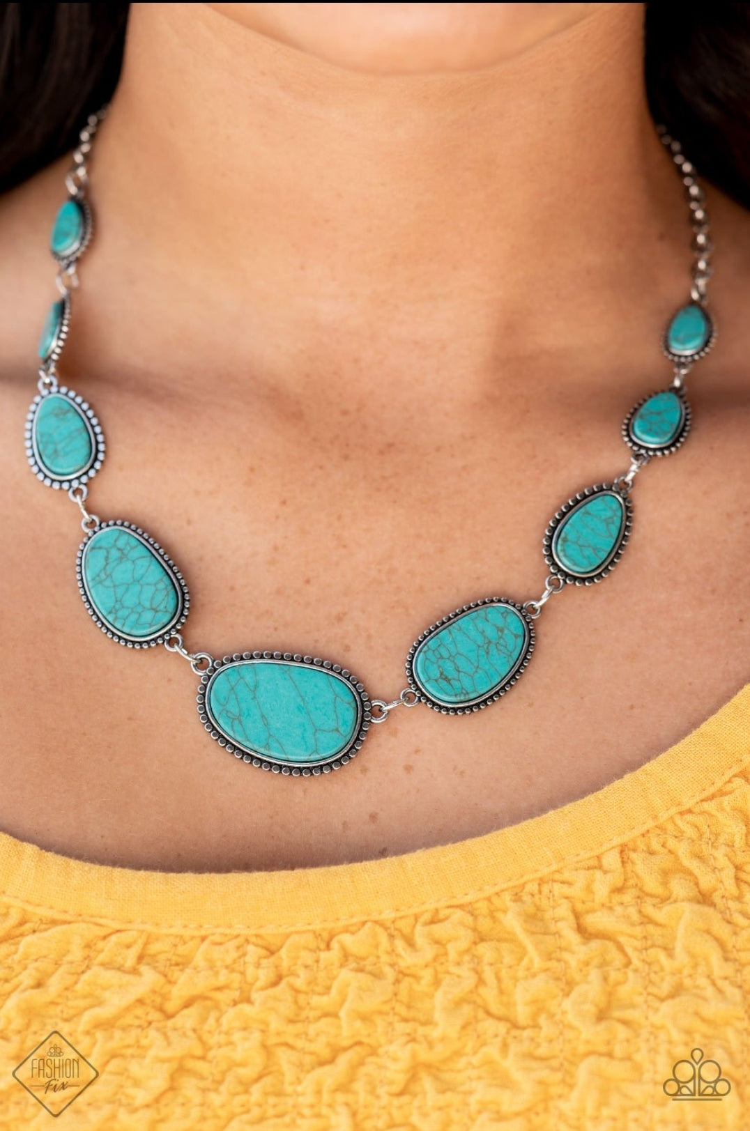 Necklace: "Elemental Eden" (P2SE-BLXX-447CP)- Encased in frames of flattened silver studs, pieces of flat turquoise stone teardrops and asymmetrical ovals gradually increase in size as they link below the collar for an artisan-inspired look. Features an adjustable clasp closure.