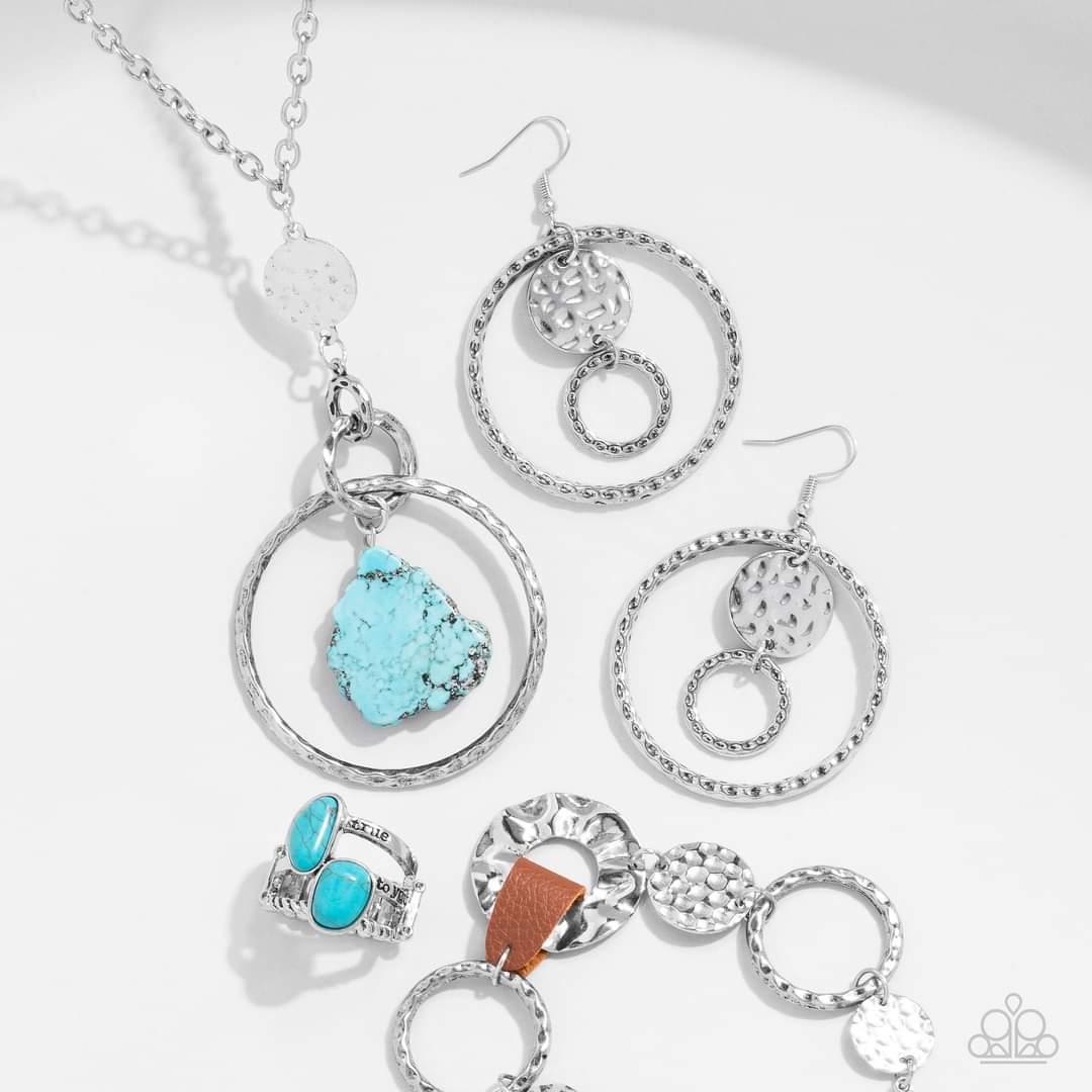 Necklace: "Keep the PIECE - Blue" (P2SE-BLXX-509JB) -- A chiseled piece of turquoise stone swings from a collision of interconnected silver hoops rich in handcrafted texture. A hammered silver disc anchors the swinging pendant at the bottom of a bulky silver chain, completing the artisanal statement piece. Features an adjustable clasp closure. Sold as one individual necklace. Includes one pair of matching earrings.