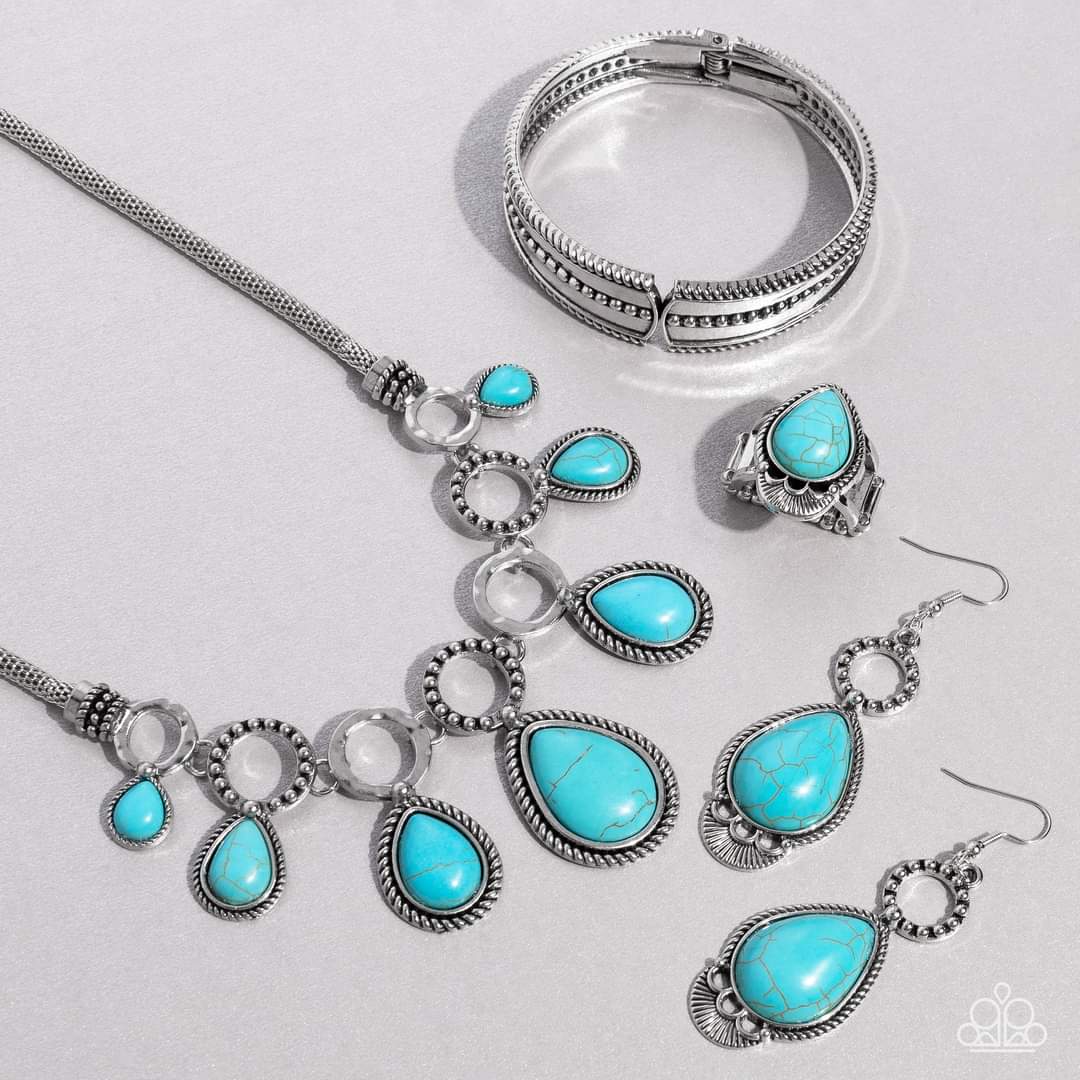 RING: Rural Rapids - Blue - P4SE-BLXX-282JL -- Pressed into a textured silver teardrop frame, a refreshing turquoise stone stands out atop the finger. Airy hoops and studded lines frame the bottom of the teardrop for additional texture. Features a stretchy band for a flexible fit.