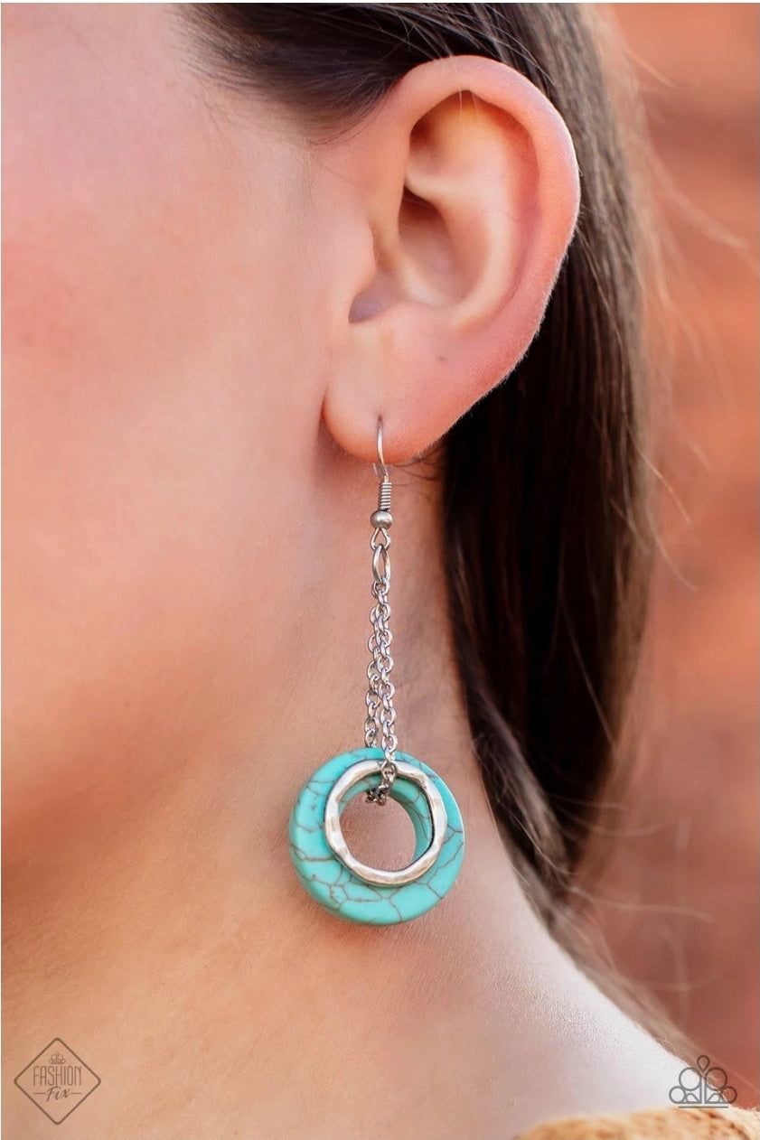 Earring: "Mojave Oasis" (P5SE-BLXX-197RN)- A dainty silver ring and turquoise stone ring are threaded along a shimmery silver chain fitting, creating a free-spirited design with lots of movement. Earring attaches to a standard fishhook fitting.