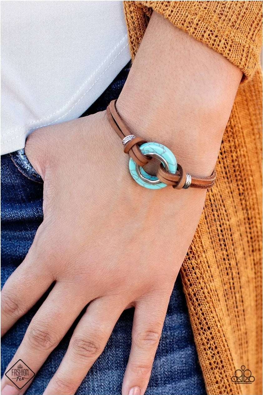 Bracelet: "Sahara Springs" (P9UR-BLXX-153RN)- Infused with ornate silver rings, strips of brown suede knot around a smooth turquoise stone ring, creating an earthy centerpiece. Features an adjustable clasp closure.