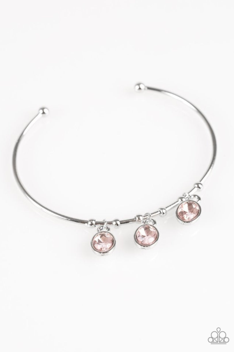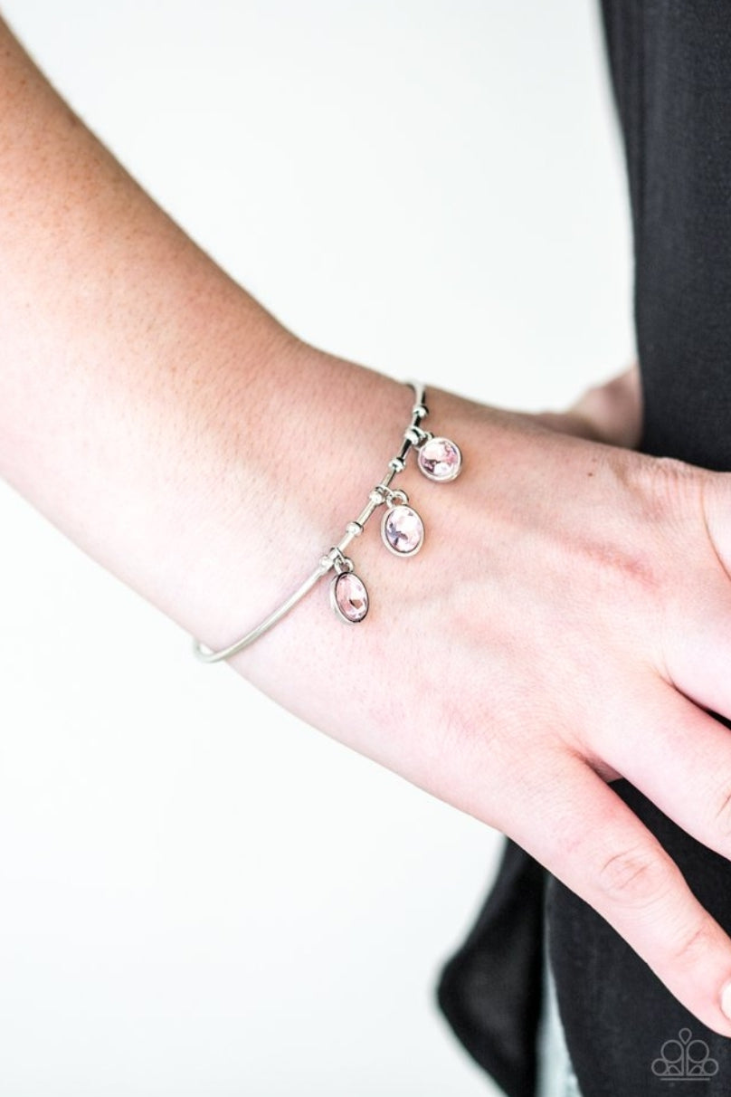 A skinny silver bar arcs across the wrist, creating a dainty cuff. Secured in place, glittery pink rhinestones swing from the wrist for a glamorous finish.