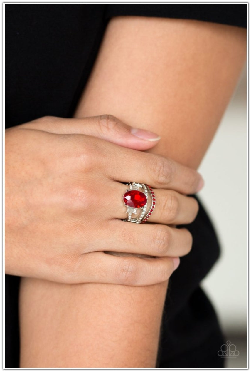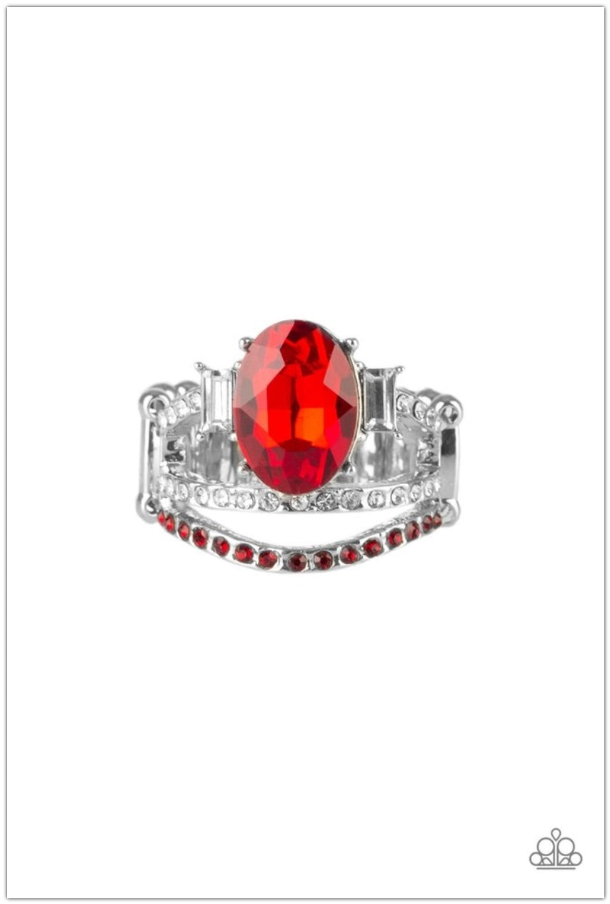 Encrusted with fiery red and glassy white rhinestones, three shimmery silver bands arc across the finger. The uppermost band is crowned with a dramatic red rhinestone for a regal finish. Features a stretchy band for a flexible fit.