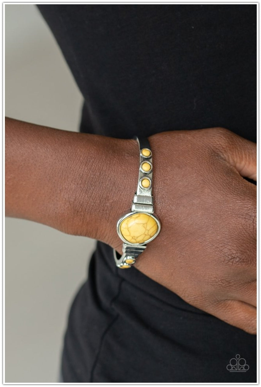 Dotted in dainty yellow stones, a dainty silver cuff attaches to an asymmetrical yellow stone centerpiece for an earthy flair.