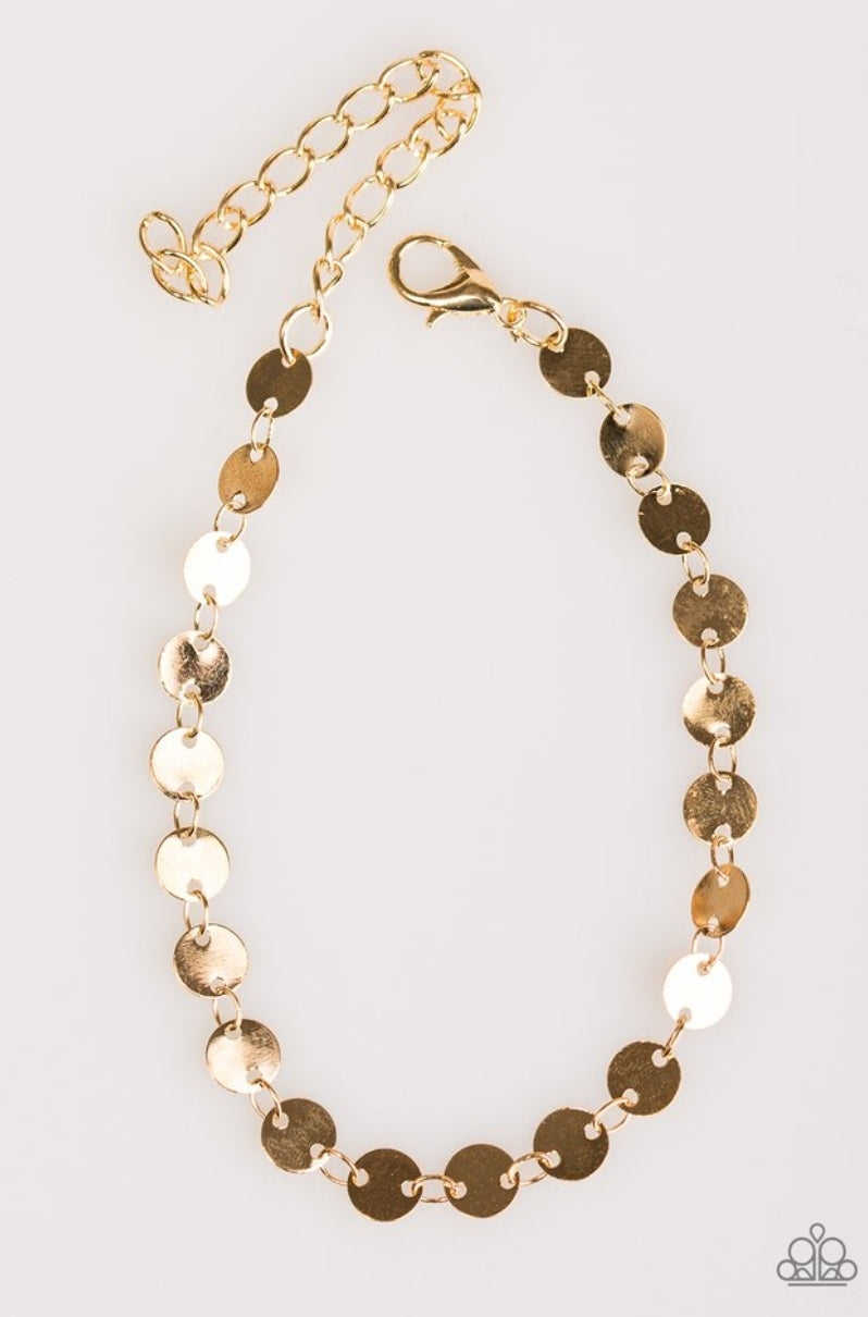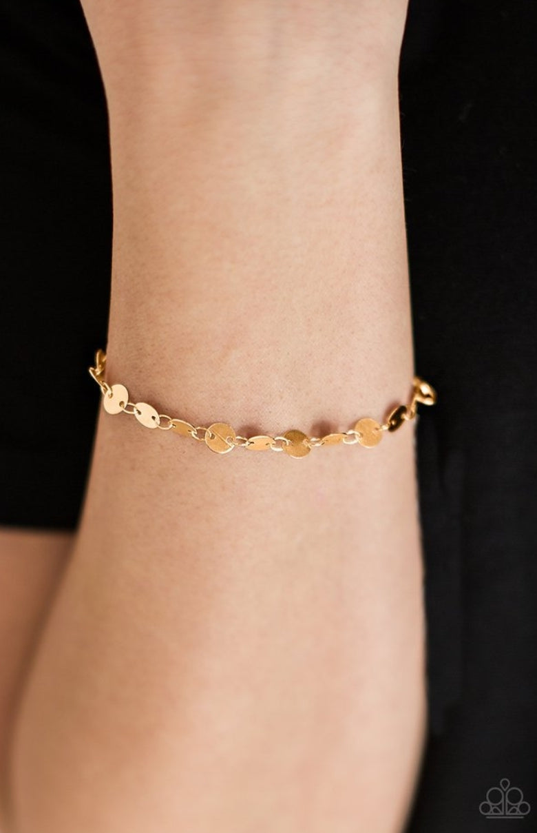 Brushed in a shiny finish, flat gold discs link across the wrist in an undeniably shimmery fashion. Features an adjustable clasp closure.