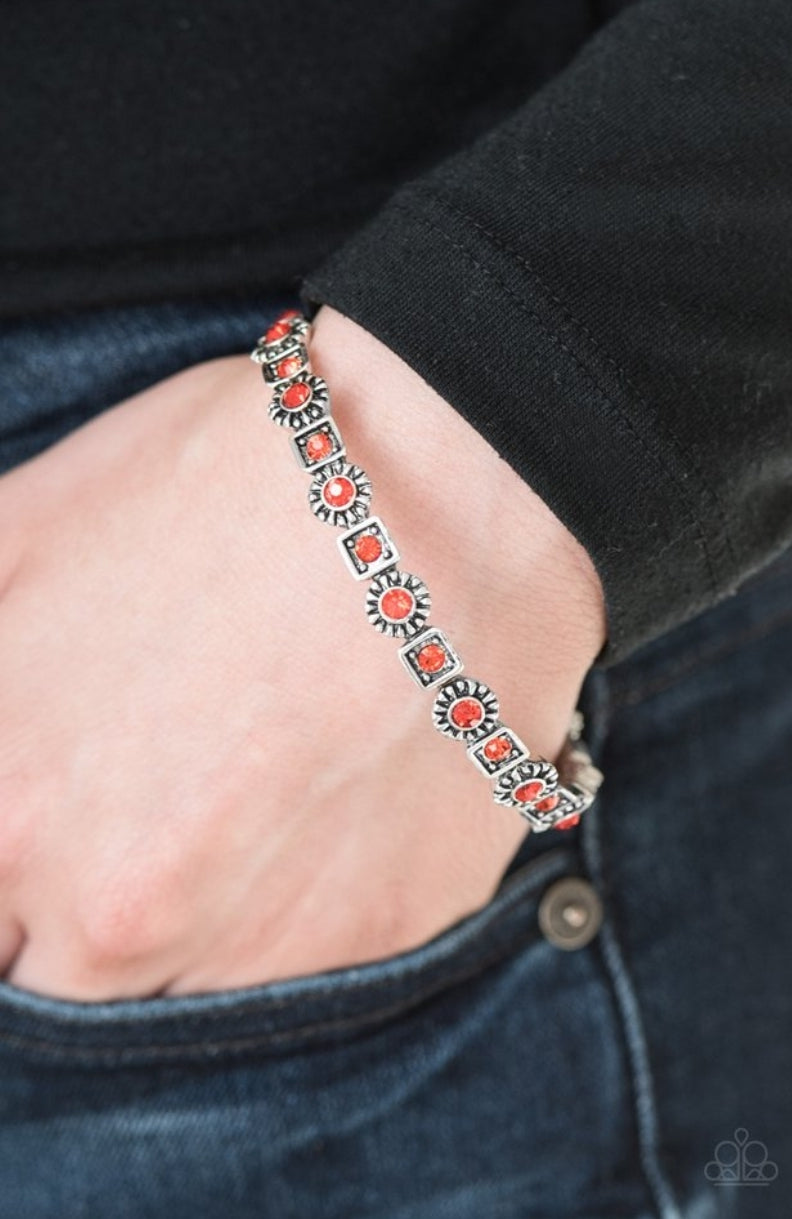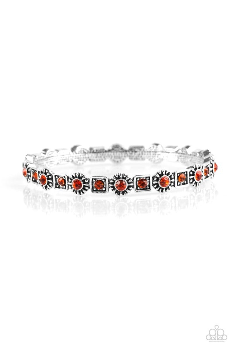 Sparkling orange rhinestones are pressed into the centers of silver floral and square frames. The glittery frames connect around the wrist, coalescing into a whimsical bangle.