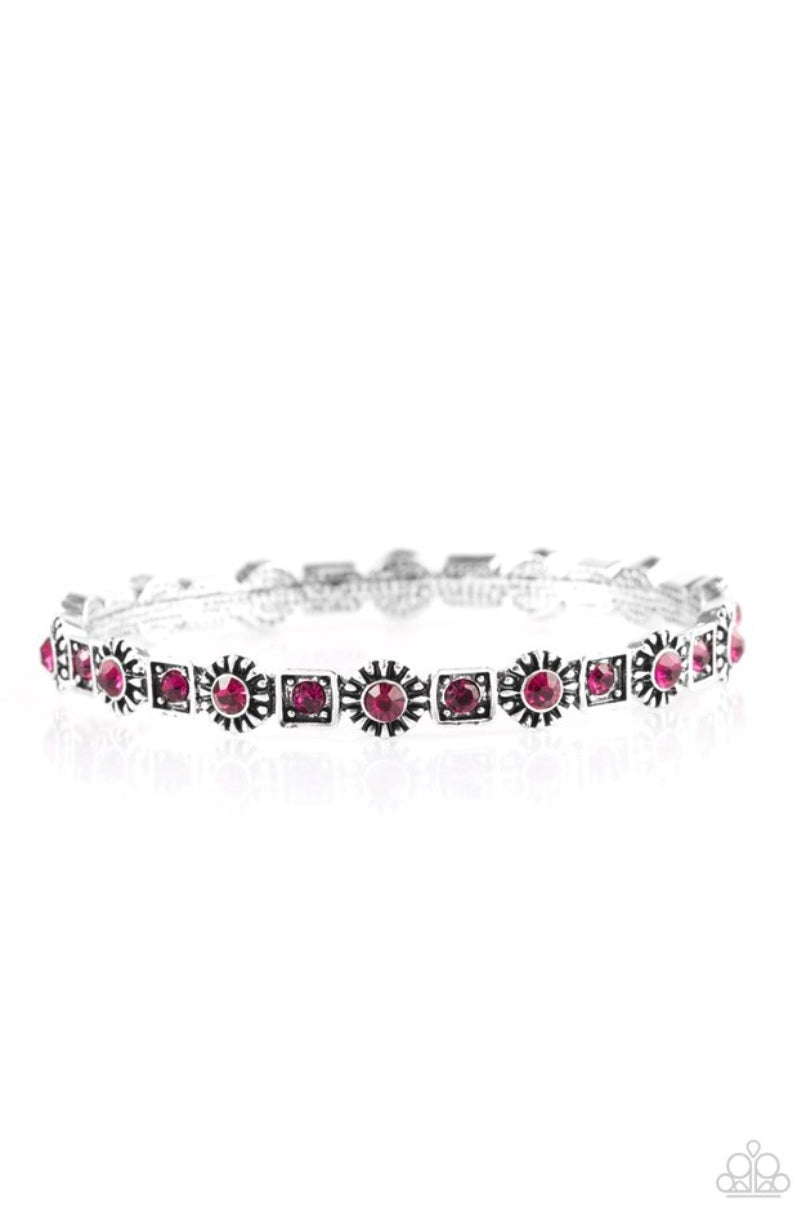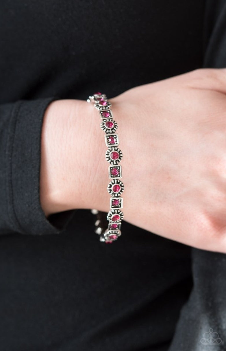 Sparkling pink rhinestones are pressed into the centers of silver floral and square frames. The glittery frames connect around the wrist, coalescing into a whimsical bangle.