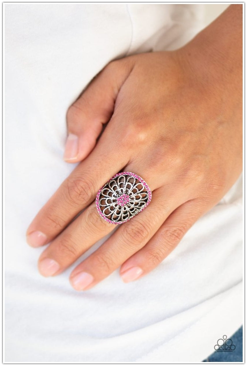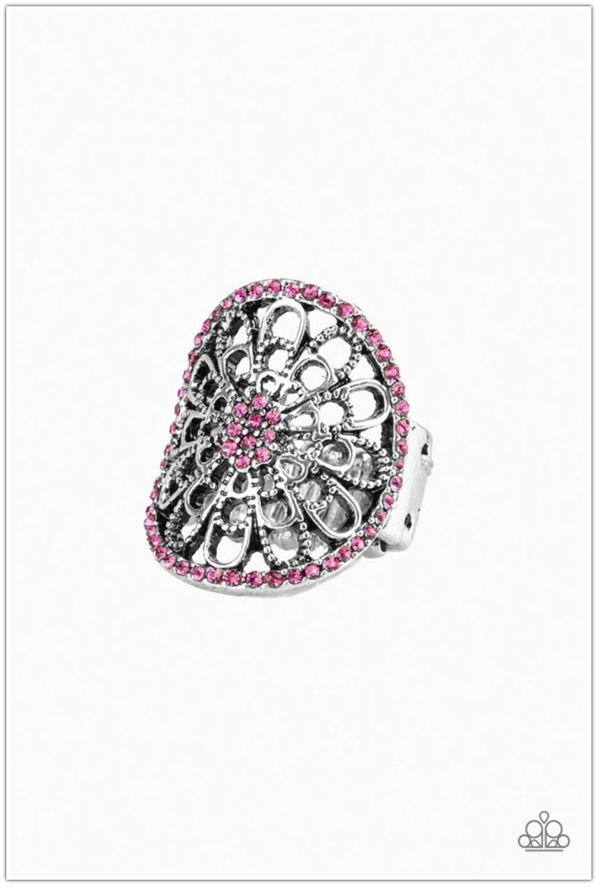 Radiating with dainty pink rhinestones, frilly silver filigree blooms across the finger into a whimsical floral frame. Features a stretchy band for a flexible fit.