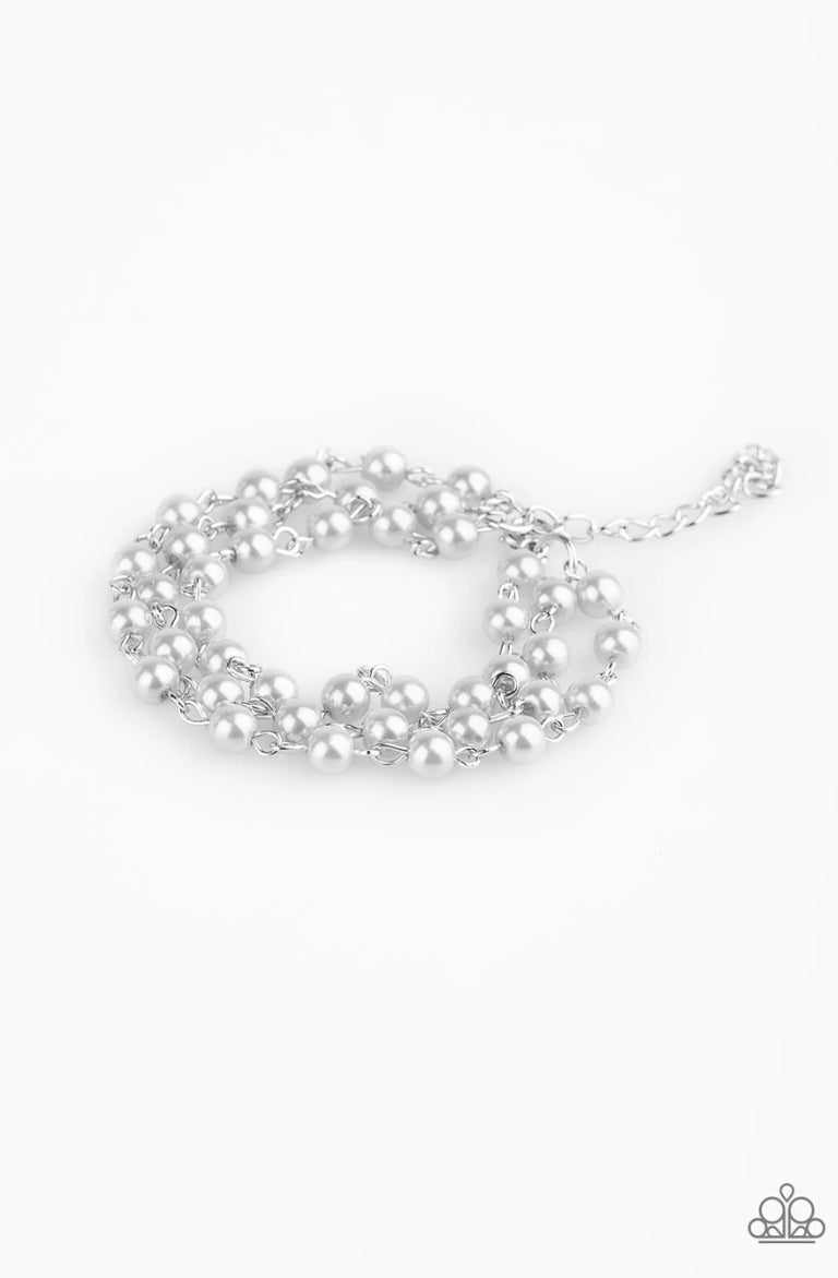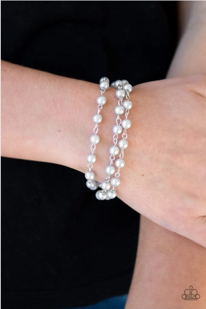 Three strands of silver pearls join around the wrist, creating timeless layers. Features an adjustable clasp closure.