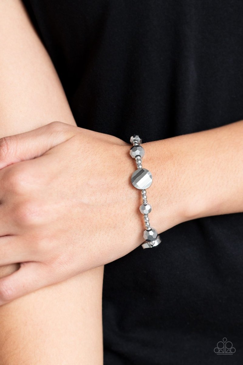 A collection of glittery hematite beads and shiny silver beads are threaded along a stretchy band around the wrist for a refined look.
