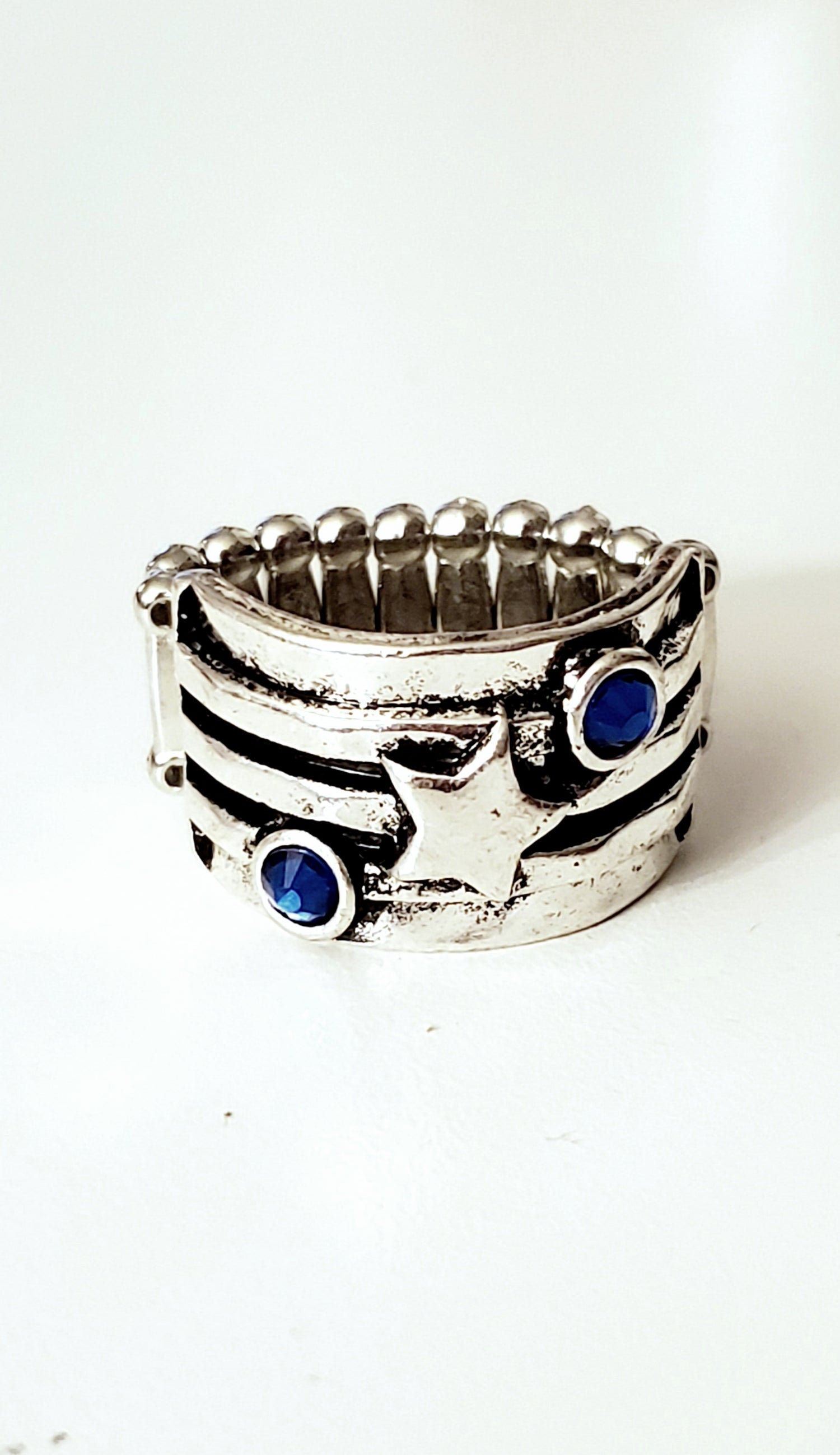 Dotted with a pair of glassy blue rhinestones and a shimmery silver star, antiqued silver bands race across the front of a delicately hammered frame for a seasonal look. Features a stretchy band for a flexible fit.