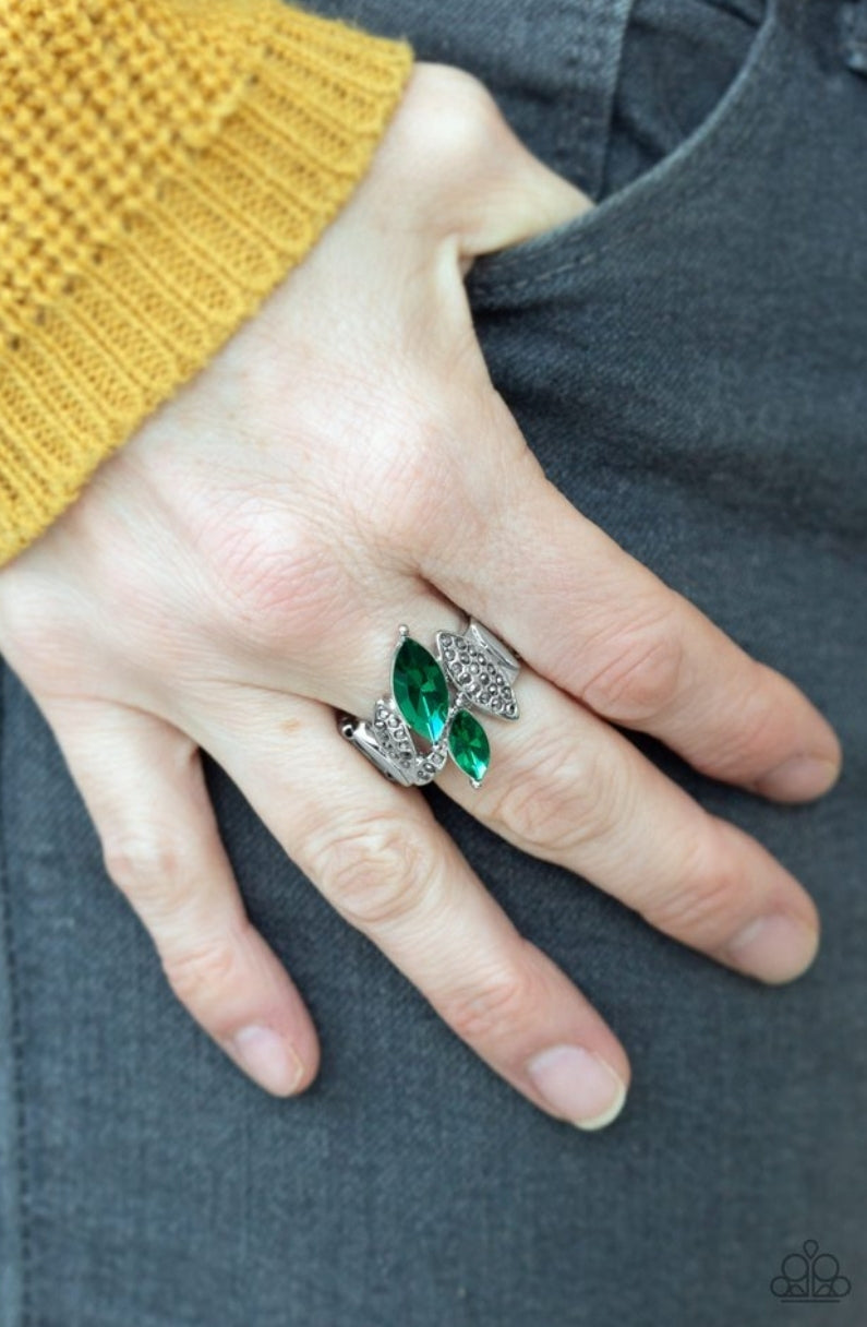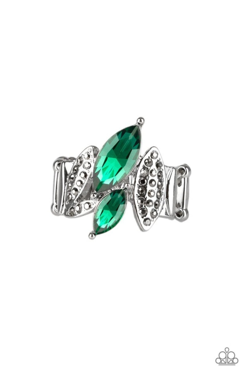 Featuring elegant marquise style shapes, hematite rhinestone encrusted silver frames and glittery green rhinestones connect across the finger for an edgy-glamorous look. Features a stretchy band for a flexible fit.