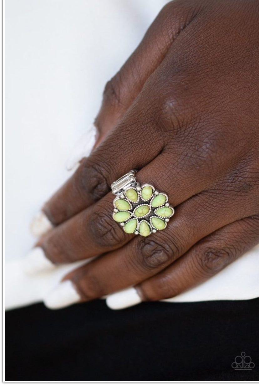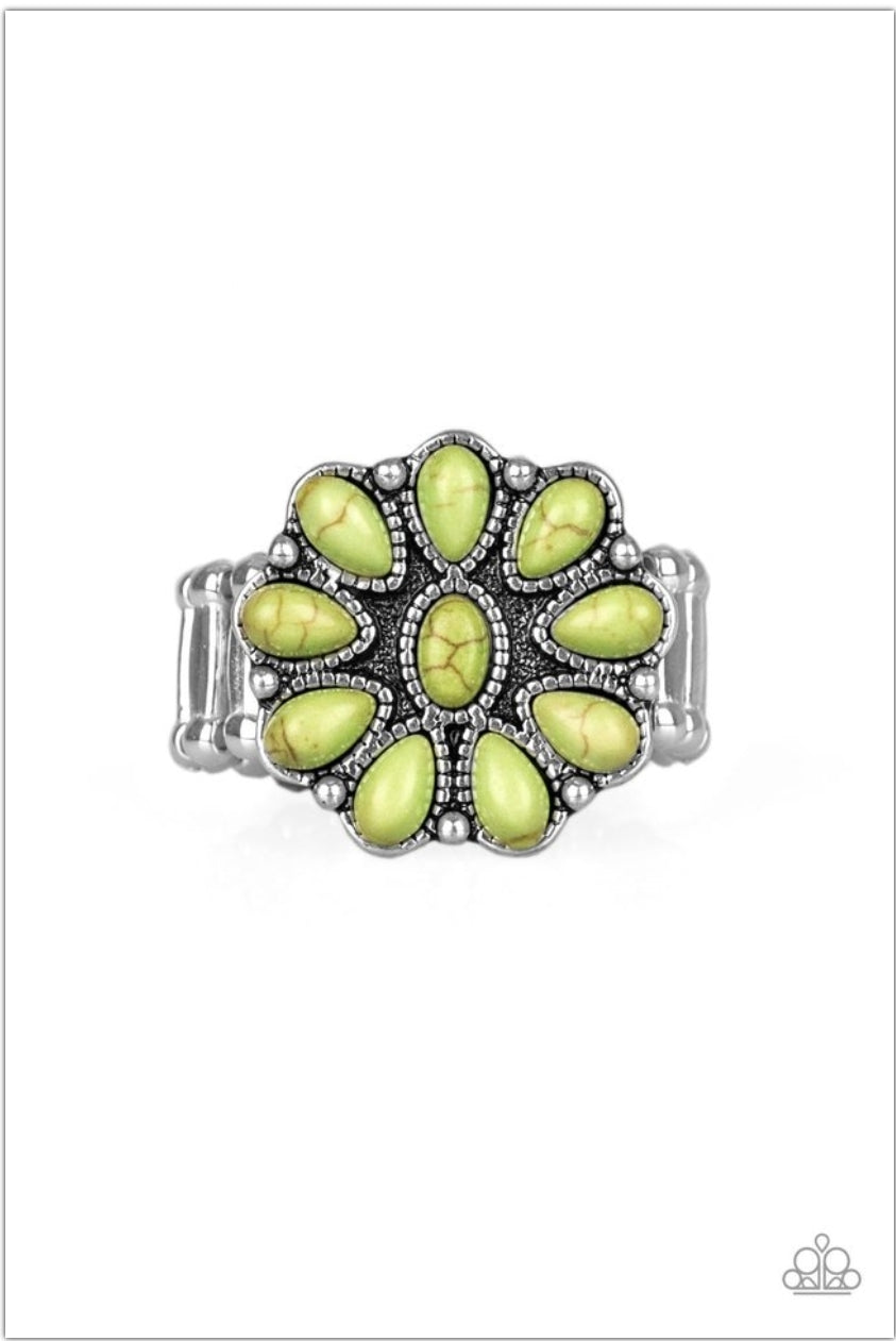 Featuring oval and teardrop refreshing green stones are pressed into a studded silver frame, creating an earthy flower atop the finger. Features a stretchy band for a flexible fit.