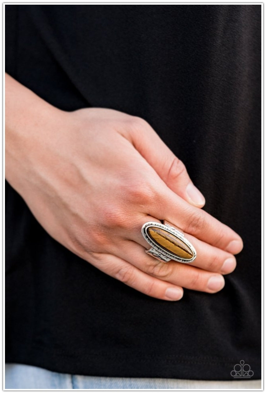An oblong Tiger’s Eye stone sits atop a hammered silver frame atop a hammered silver band, creating an earthy statement piece. Features a stretchy band for a flexible fit.