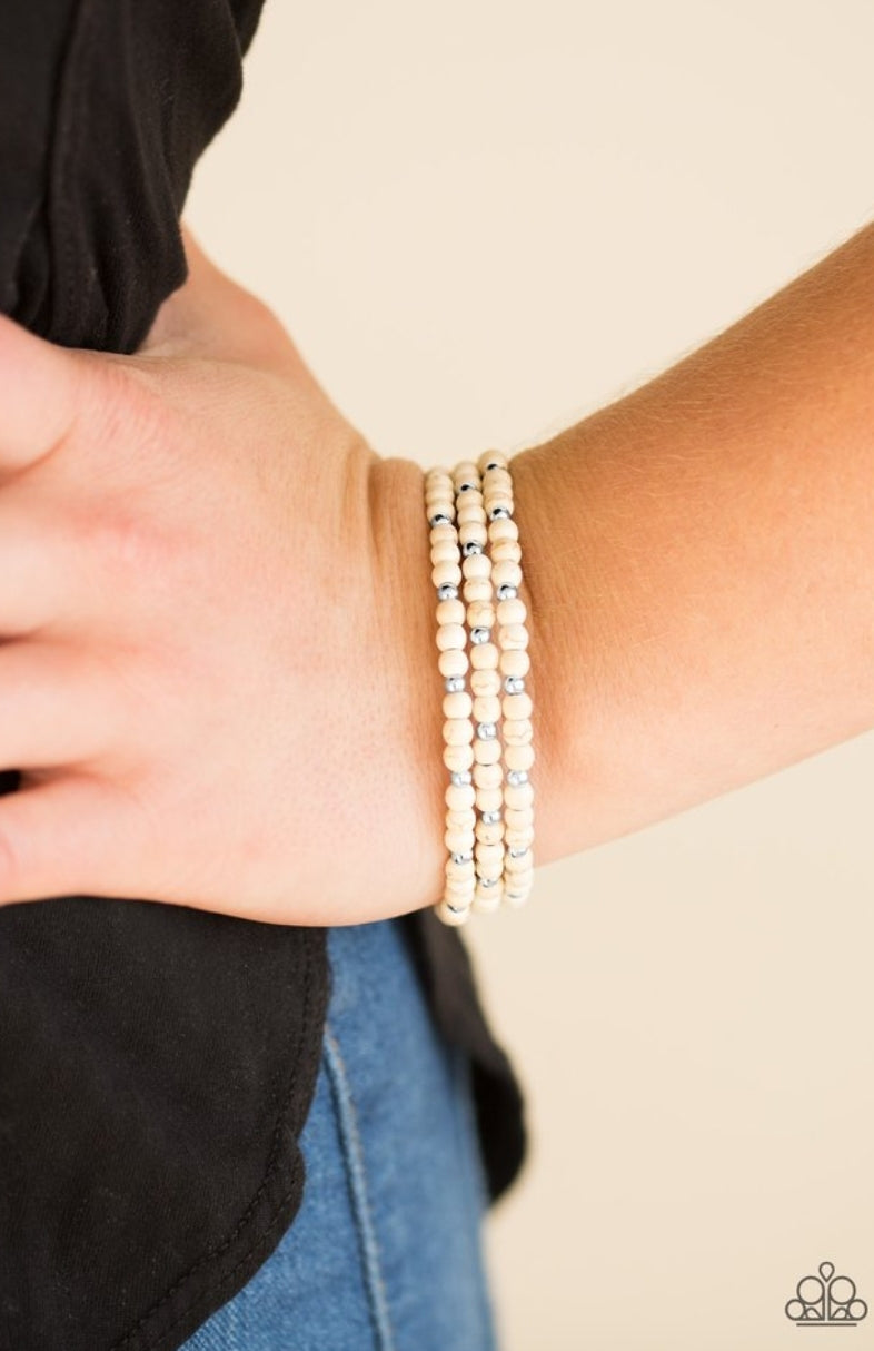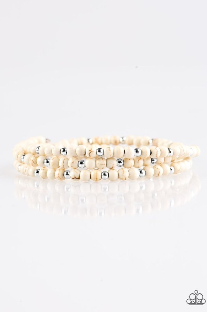 Dainty silver beads and smooth white stone accents are threaded along a coiled wire, creating an earthy infinity wrap style bracelet.