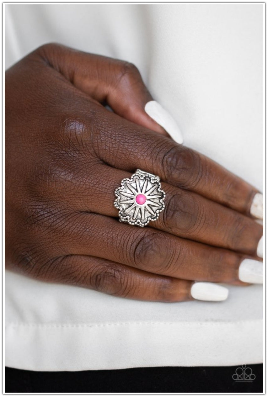 A dainty pink stone bead is pressed into the center of an antiqued silver frame radiating with floral detail for a seasonal flair. Features a stretchy band for a flexible fit.