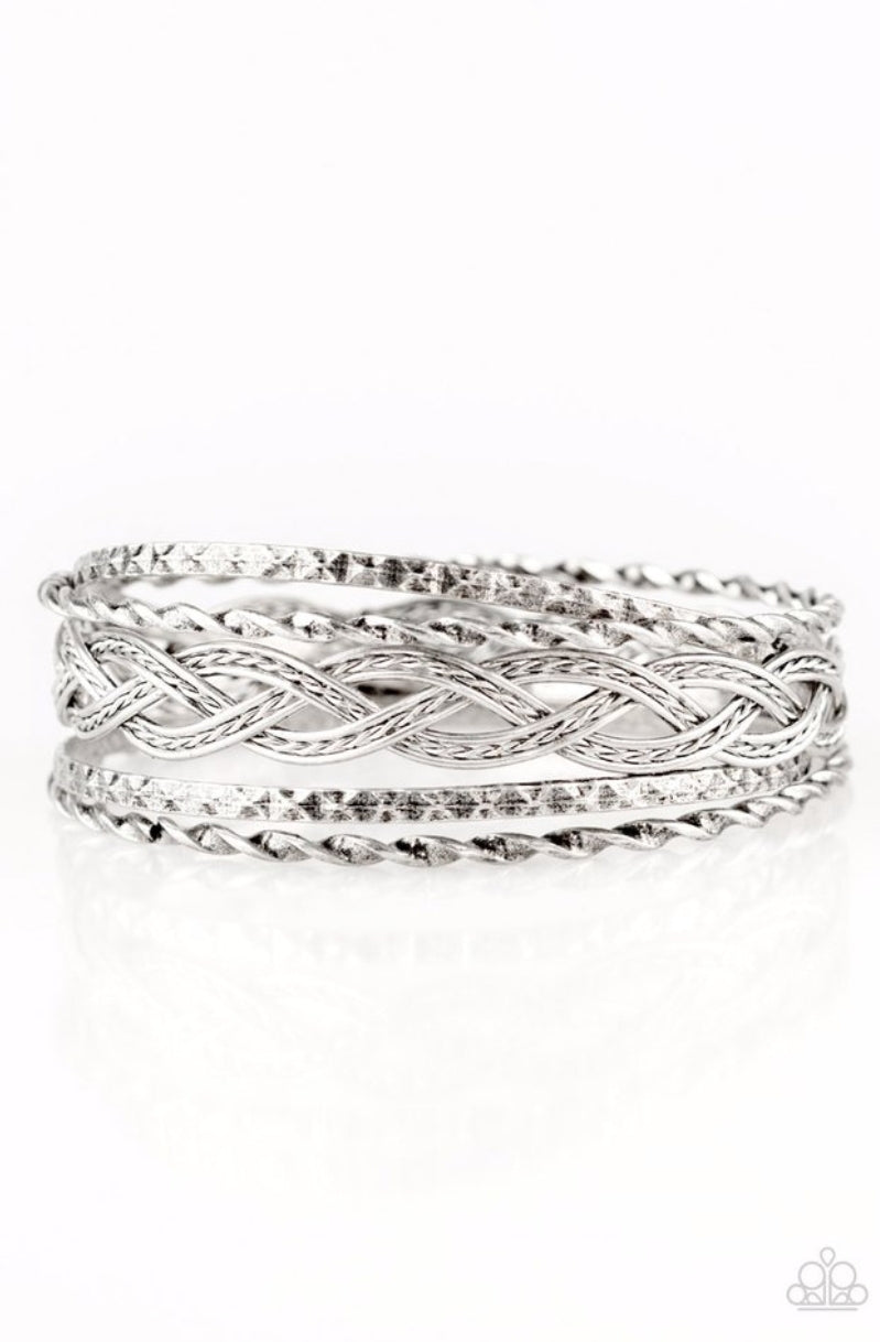 Featuring smooth and textured finishes, mismatched silver bangles glide along the wrist for a causal fashion.