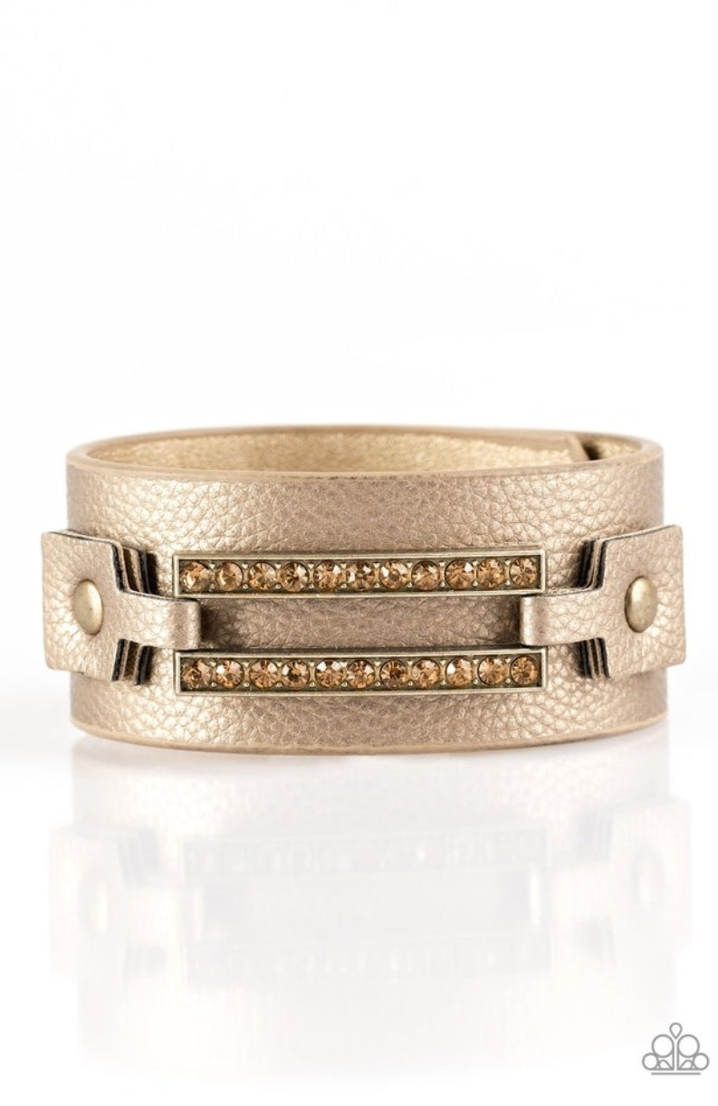 Encrusted in golden topaz rhinestones, a glistening brass frame is studded in place across the front of a metallic brown band for an edgy look. Features an adjustable snap closure.