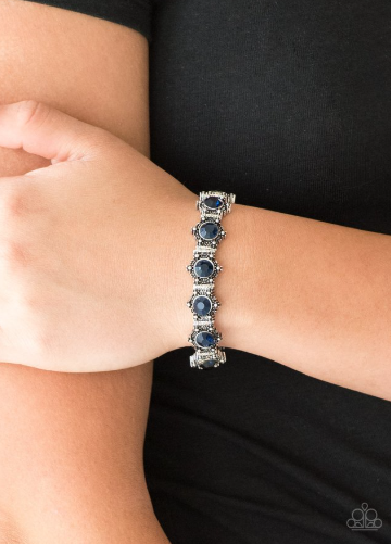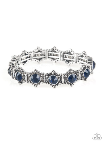 Featuring glittery blue rhinestone centers, ornate silver frames are threaded along stretchy bands, linking across the wrist for a refined look.