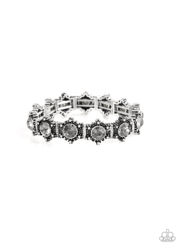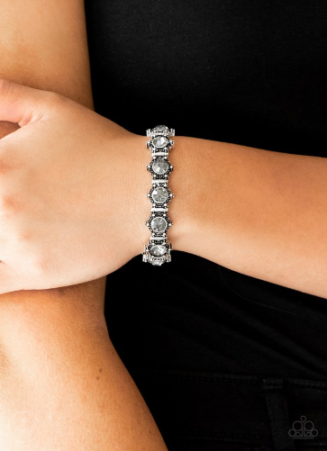 Featuring smoky rhinestone centers, ornate silver frames are threaded along stretchy bands, linking across the wrist for a refined look.