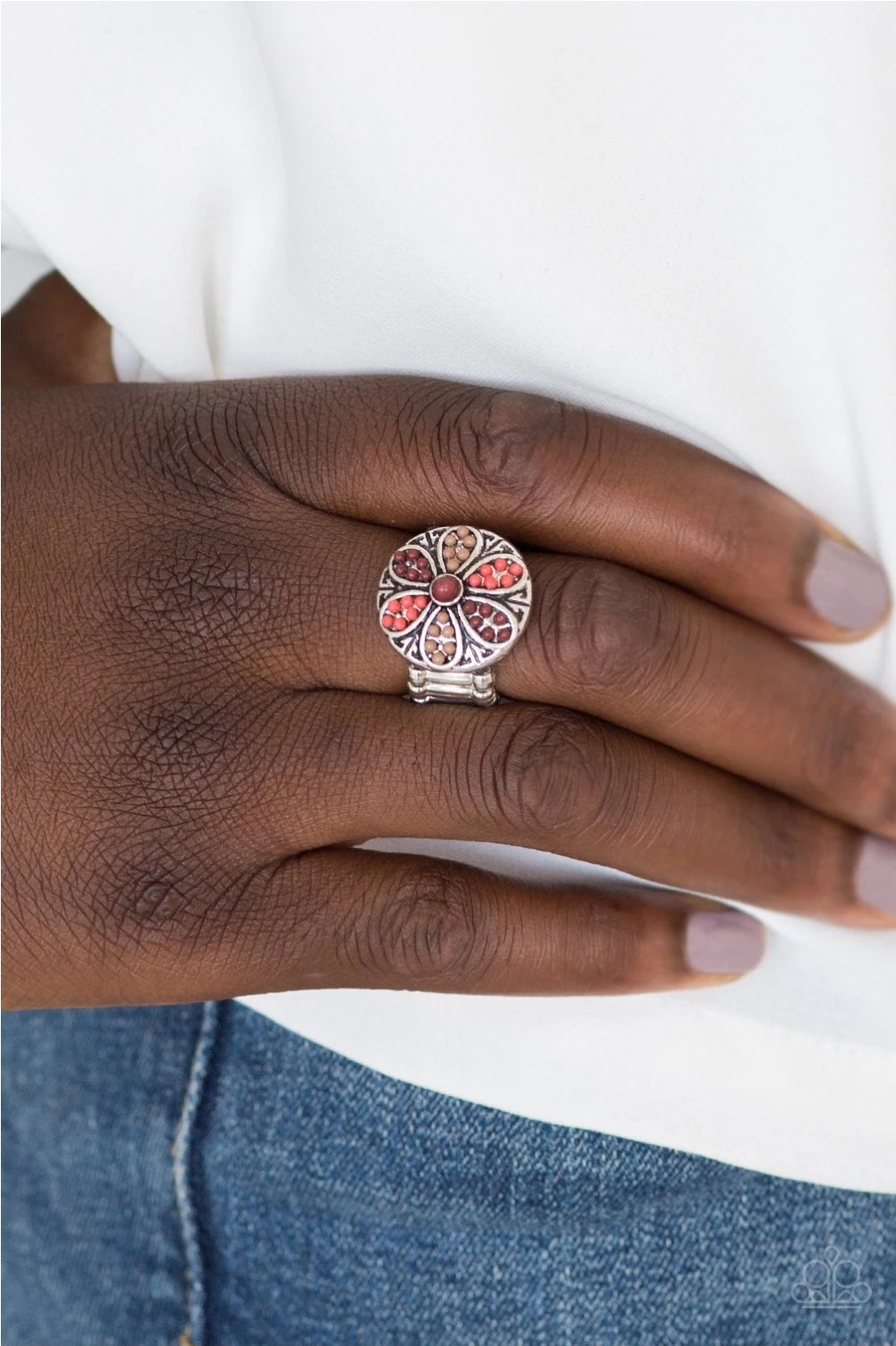 Dainty brown, tan, and pink beads adorn the petals of a whimsical floral centerpiece for a seasonal look. Features a stretchy band for a flexible fit.