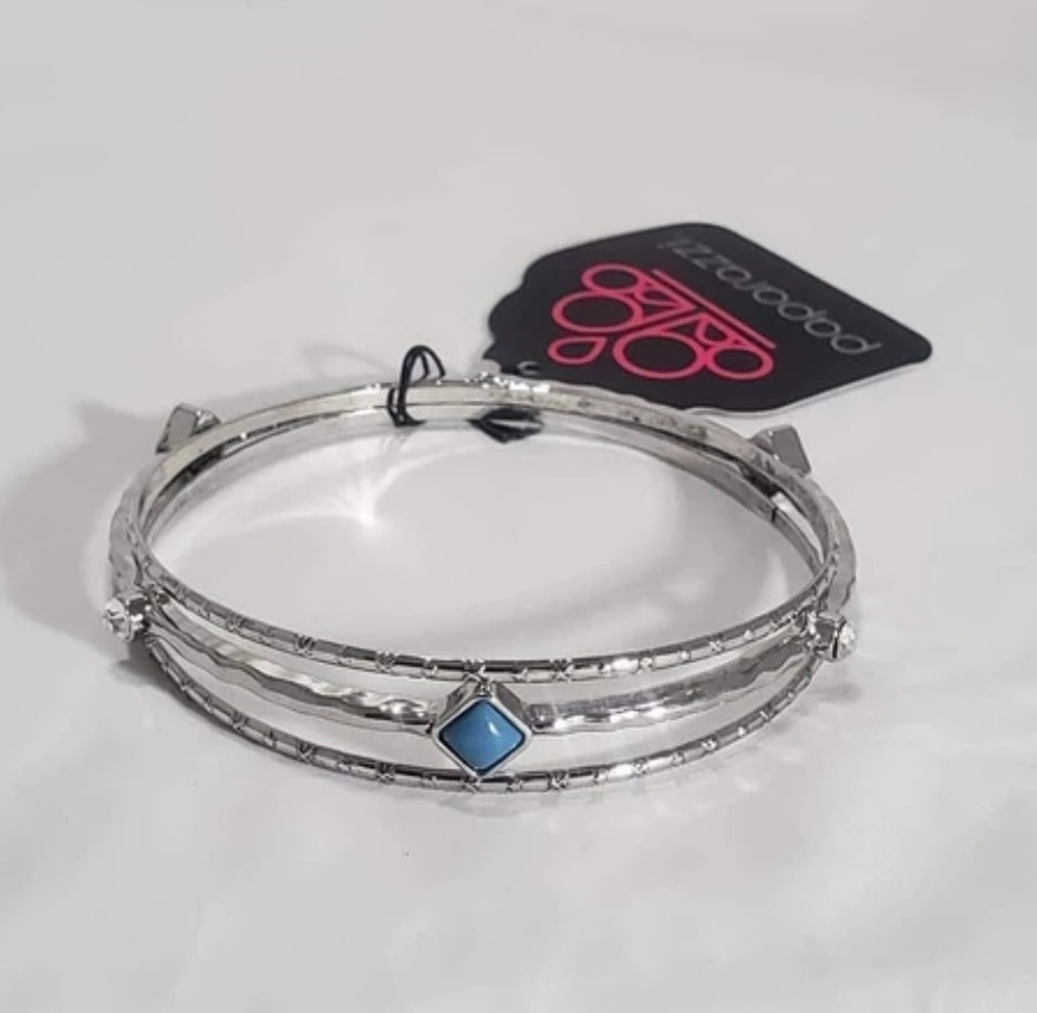 Infused with a pair of dainty textured bangles, a hammered silver bangle is encrusted in sections of glassy white rhinestones and square blue beads for a seasonal blend.