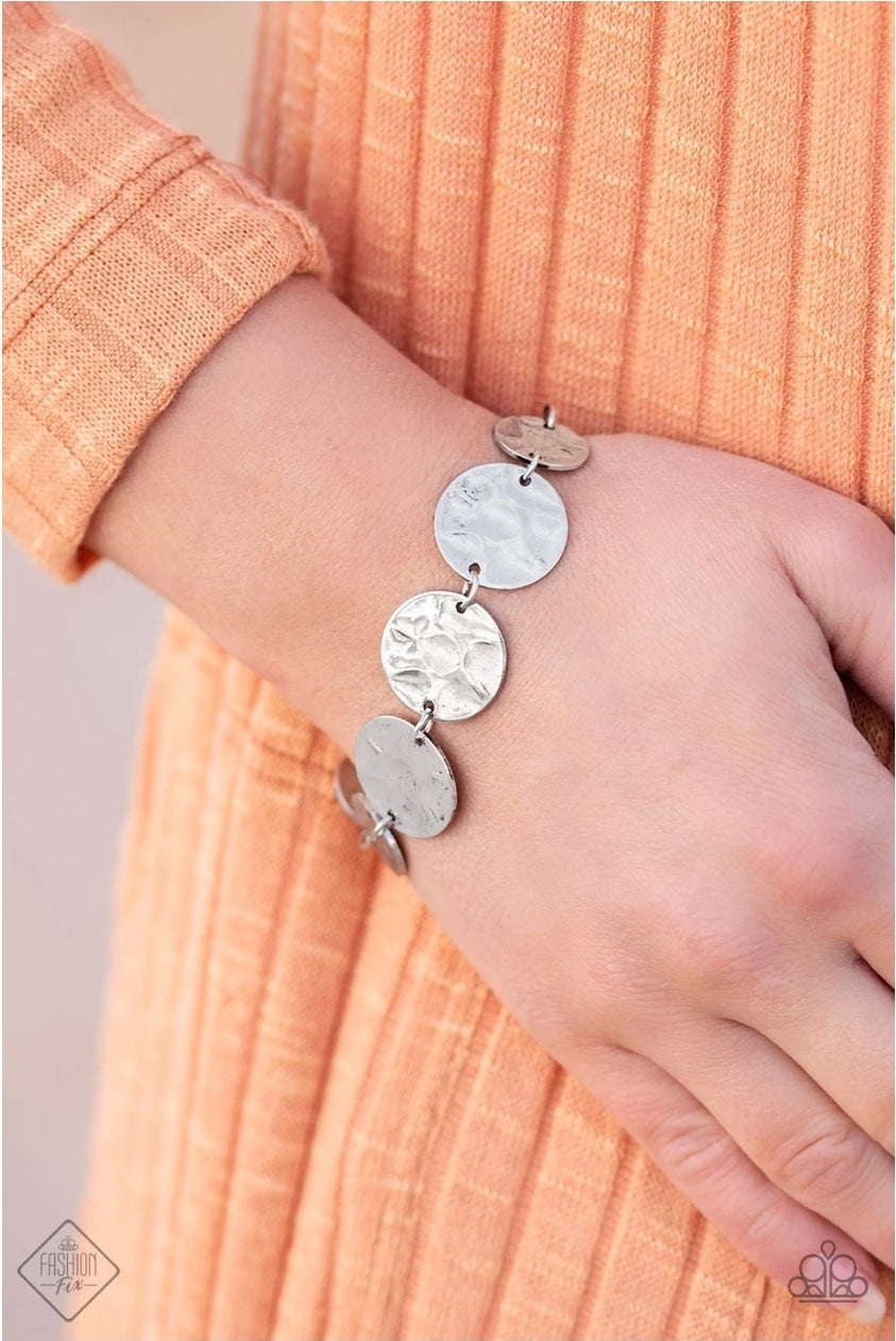 Bracelet: "Rustic Reflections" (P9BA-SVXX-047RR)-Gradually increasing in size, delicately hammered antiqued silver discs link around the wrist for a rustic flair. Features an adjustable clasp closure.