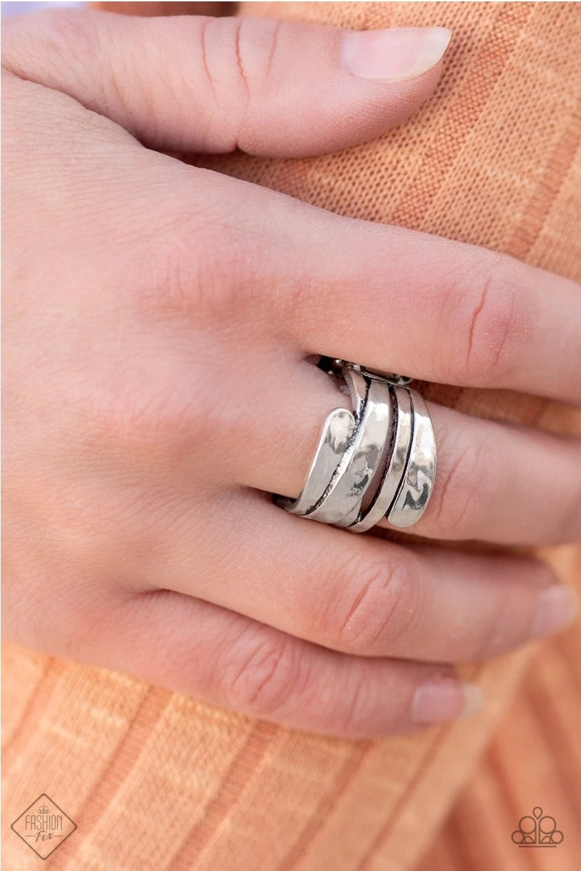 Ring: "Behind The SHEEN" (P4BA-SVXX-069RR)-Delicately hammered in shimmery details, glistening silver bands wrap back and forth across the finger for an edgy look. Features a stretchy band for a flexible fit.