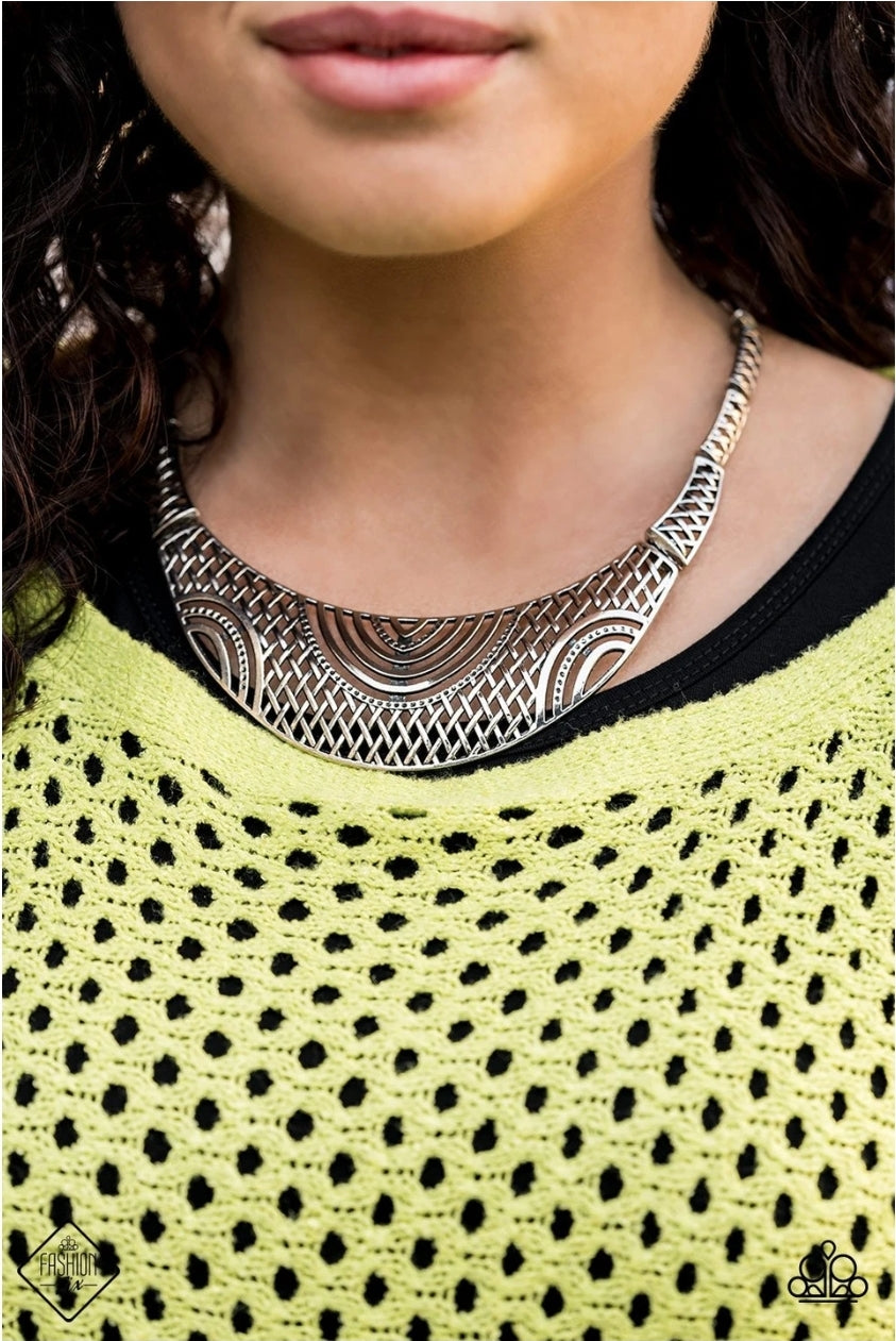 Necklace: " On The MANE Stage" (P2ST-SVXX-095RY)- Featuring crisscrossed detail, dainty silver frames link below the collar, giving way to a dramatic half-moon plate radiating with dizzying tribal details for a fierce look. Features an adjustable clasp closure.