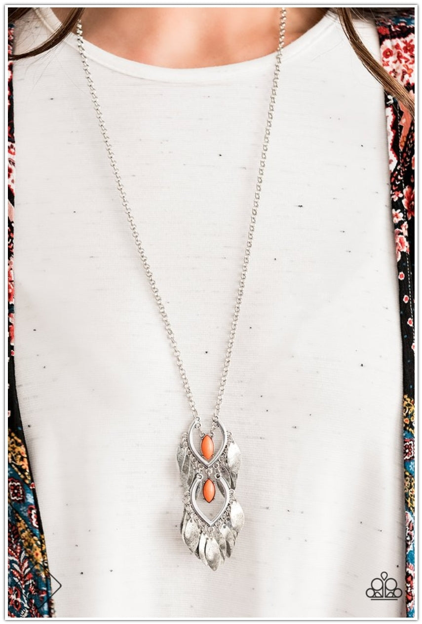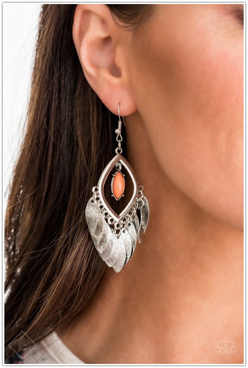 Earring - "Sunset Soul" - A refreshing coral bead swings from the top of a marquise-shaped silver frame. Delicately hammered in antiqued texture, flared silver charms cascade from the bottom of the frame, creating a noisy fringe. Earring attaches to a standard fishhook fitting.