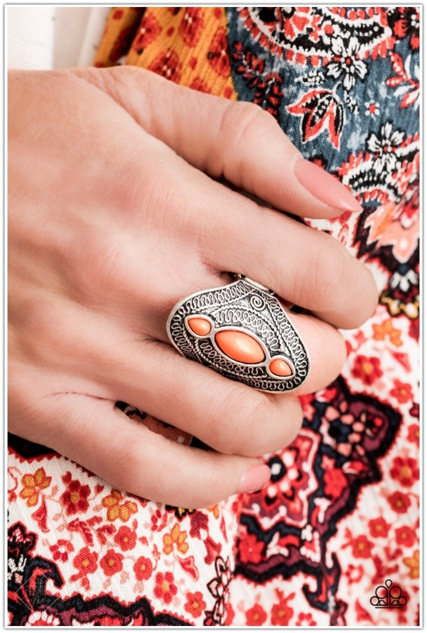 Ring - "Kindred Spirit" - Teardrop and marquise shaped coral beads are pressed into the center of a thick silver frame embossed in swirling filigree detail for a tribal inspired look. Features a stretchy band for a flexible fit.